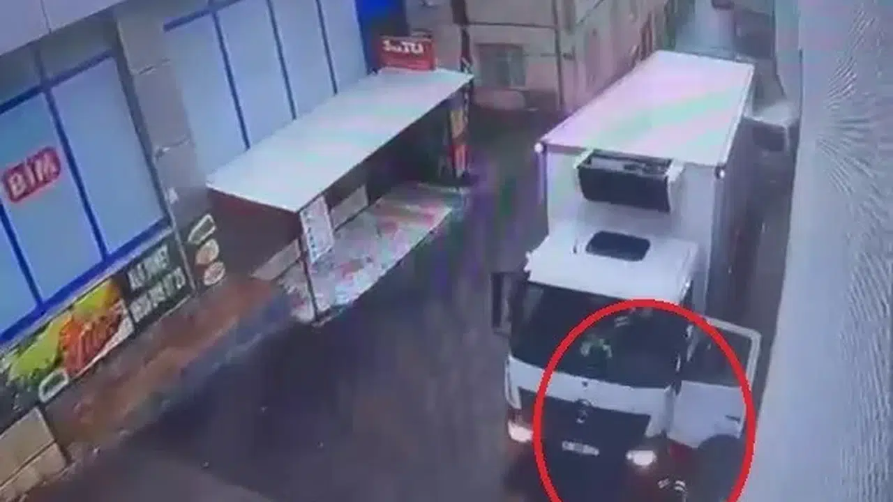 Bursa’nın merkez Yıldırım ilçesi Sıracevizler Mahallesi üzerinde sabah saatlerinde sevkiyat için yanaşan 34 GOS 127 plakalı kamyonun yokuş üzerinde ilerlerken freni boşaldı. Yokuş aşağı kayan araç sürücünün kontrolünden çıkarken, kapıdan atlamak isteyen sürücü dengesini kaybedip yere düştü. Kamyonun altında kalmaktan son anda kurtulan sürücünün o anları kameraya yansırken, BİM’e ait kamyon park halindeki 3 araca çarptıktan sonra bir evin duvarına saplandı. Kaza anı ise güvenlik kameralarına anbean yansıdı.
