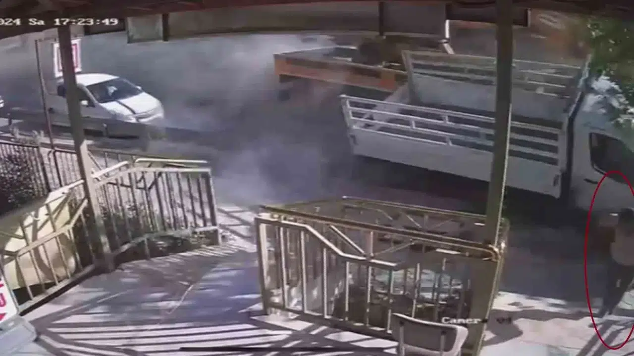Hatay’da freni patlayan hafriyat kamyonunun araçları biçtiği anlar ve kaldırımda yürüyen bir vatandaşın ölümden saniyelerle kurtulduğu anlar güvenlik kamerasına yansıdı.