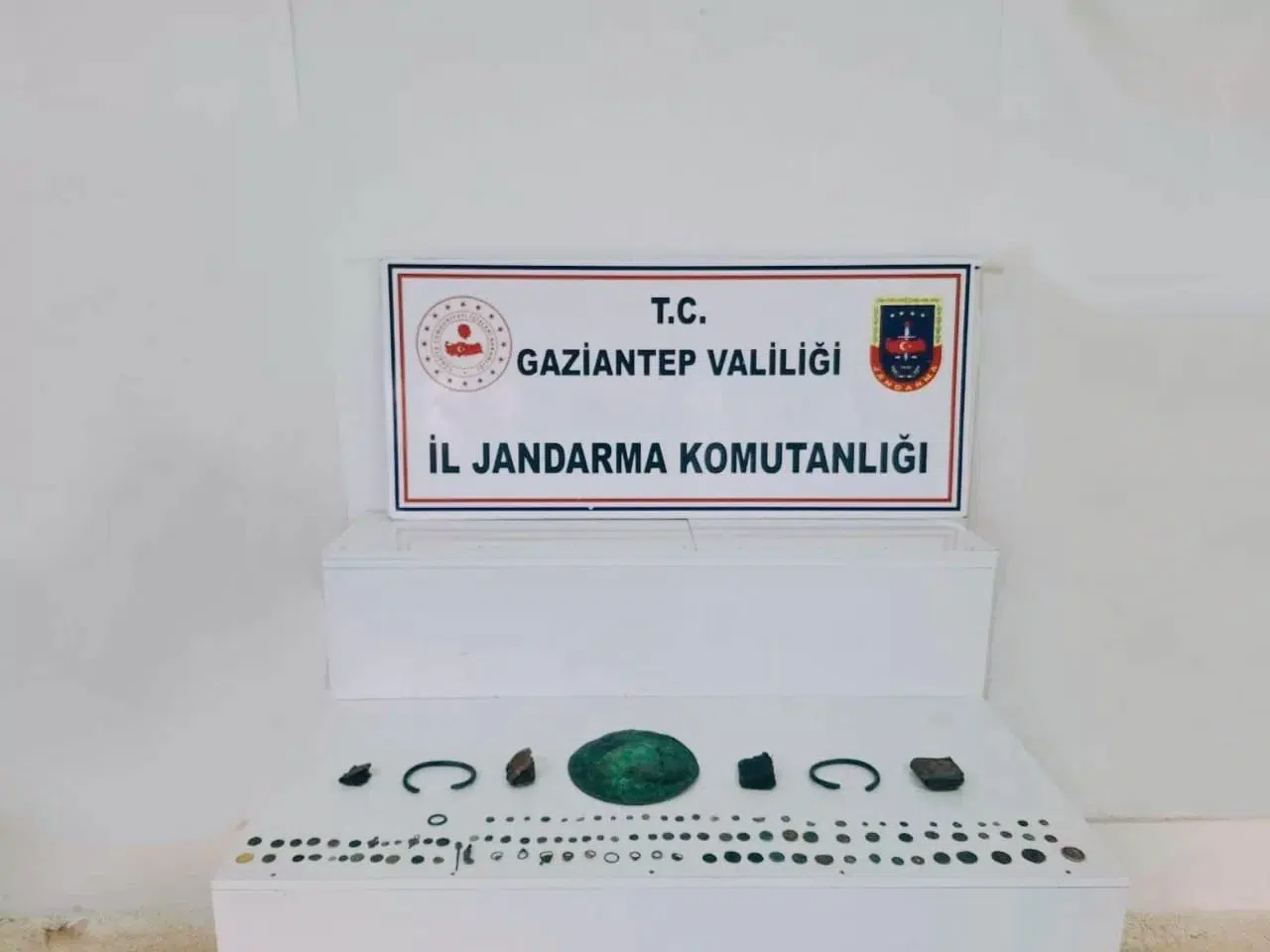 Gaziantep’te İl Jandarma Komutanlığı ve Cumhuriyet Başsavcılığı koordinesiyle Şehitkâmil ilçesinde 2 iş yerine tarihi eser operasyonu yapıldı. Fiziki ve teknik takip sonucu 2 şüpheli şahsın iş yerlerinde yapılan aramada 90 adet tarihi eser niteliğinde sikke, 9 adet tarihi eser niteliğinde yüzük, 9 adet tarihi eser niteliğinde metal obje, 4 adet tarihi eser niteliğinde kitap ve 1 adet tarihi eser niteliğinde tabak ele geçirildi.