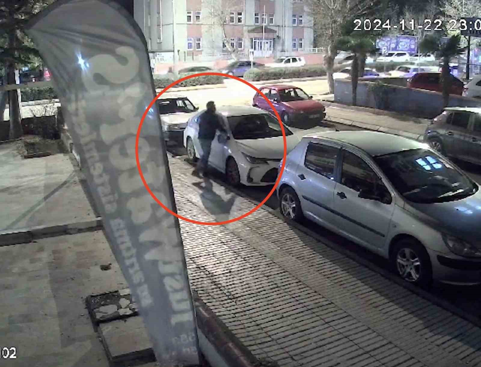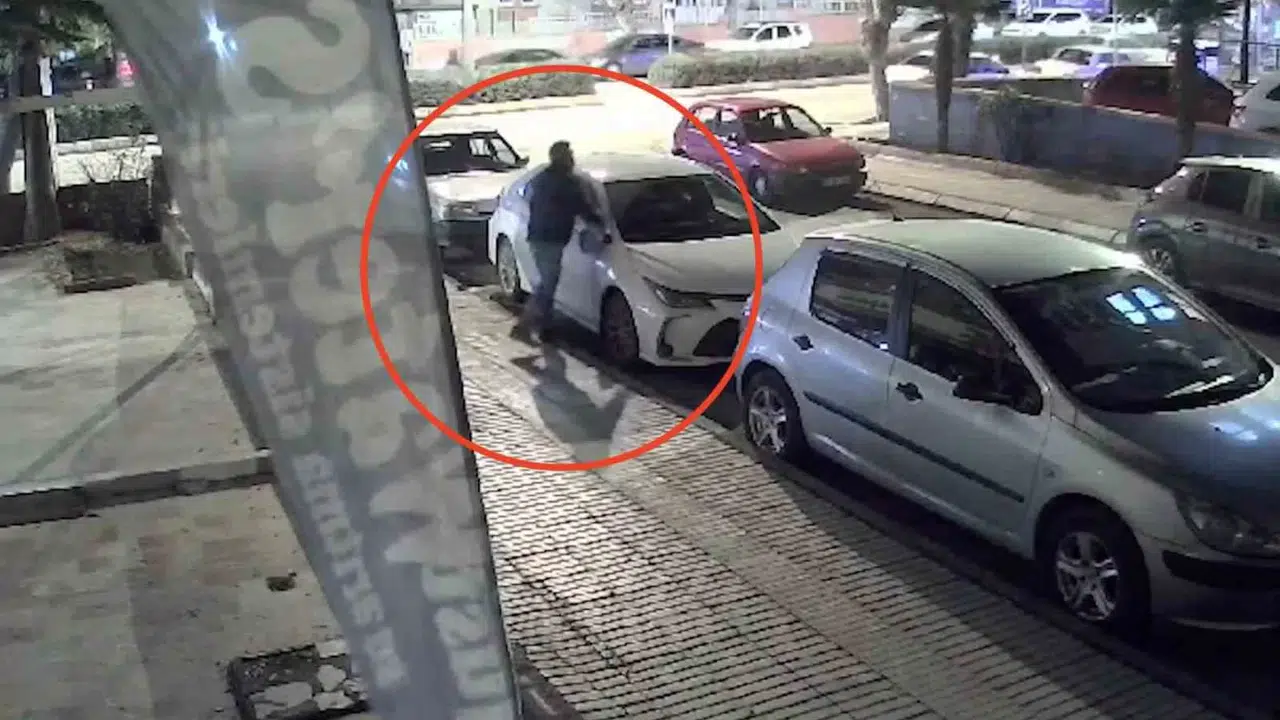 Öte yandan, şahsın araçlardan birinin aynasını kırma anı güvenlik kamerasına yansıdı. Görüntülerde, şahsın yanına geldiği otomobilin aynasını kırdığı görülüyor.