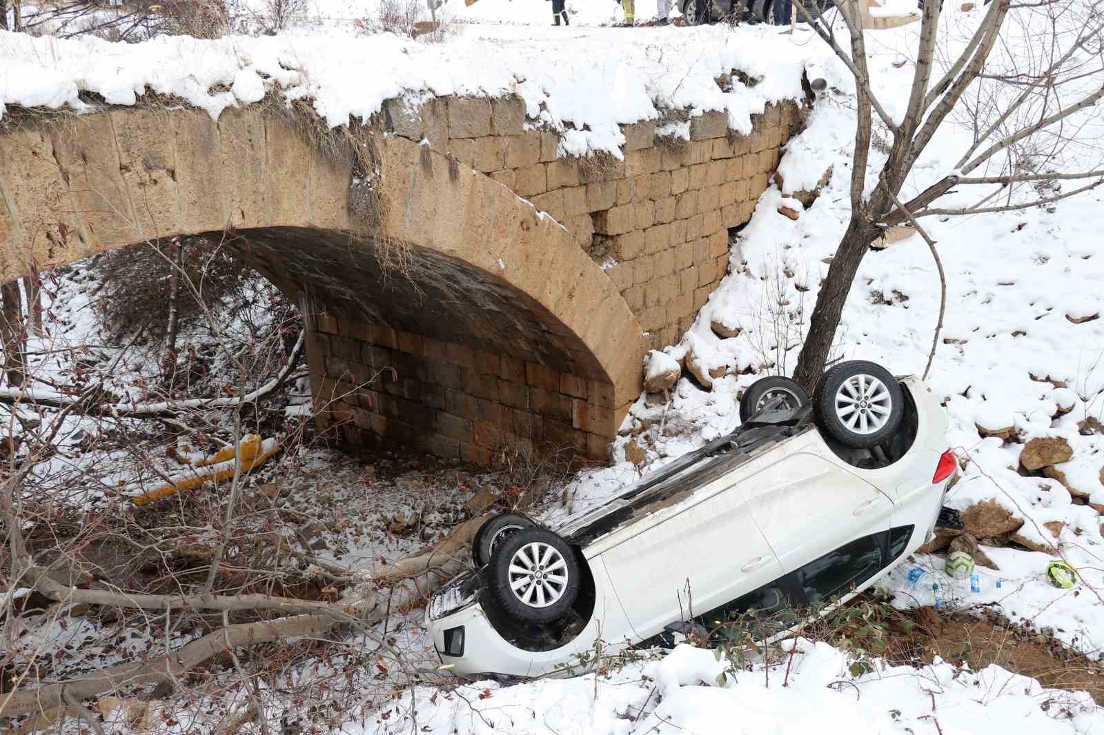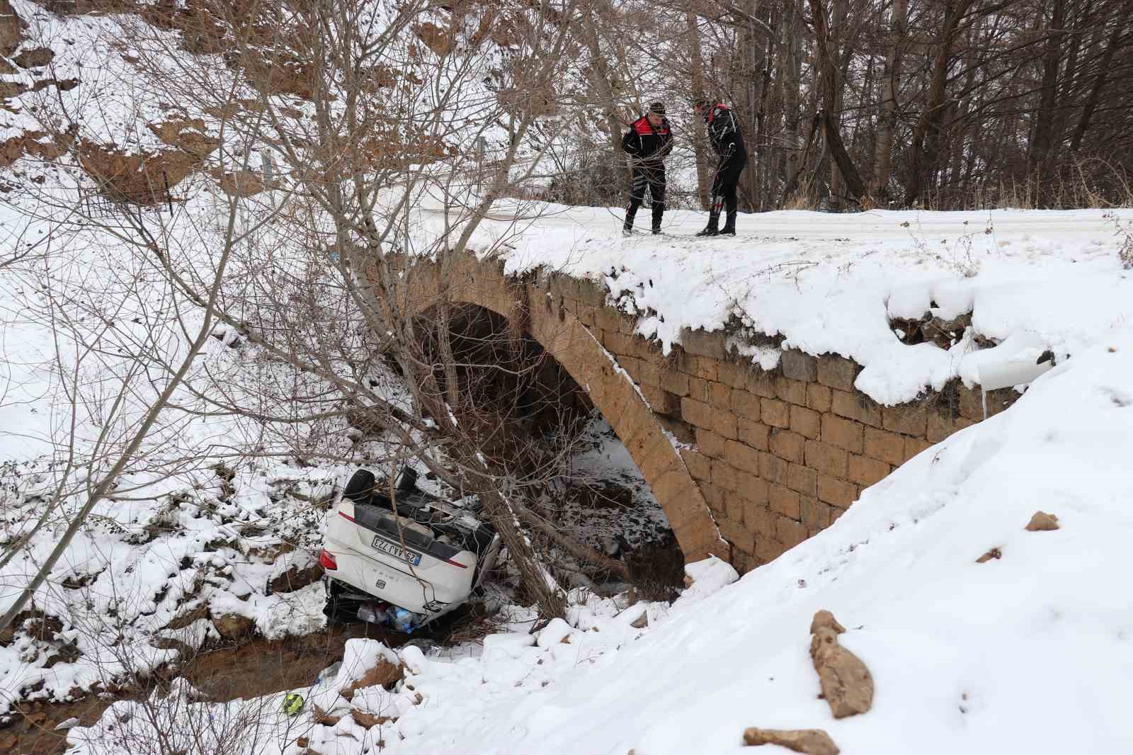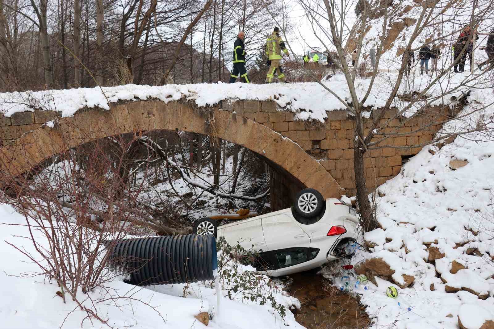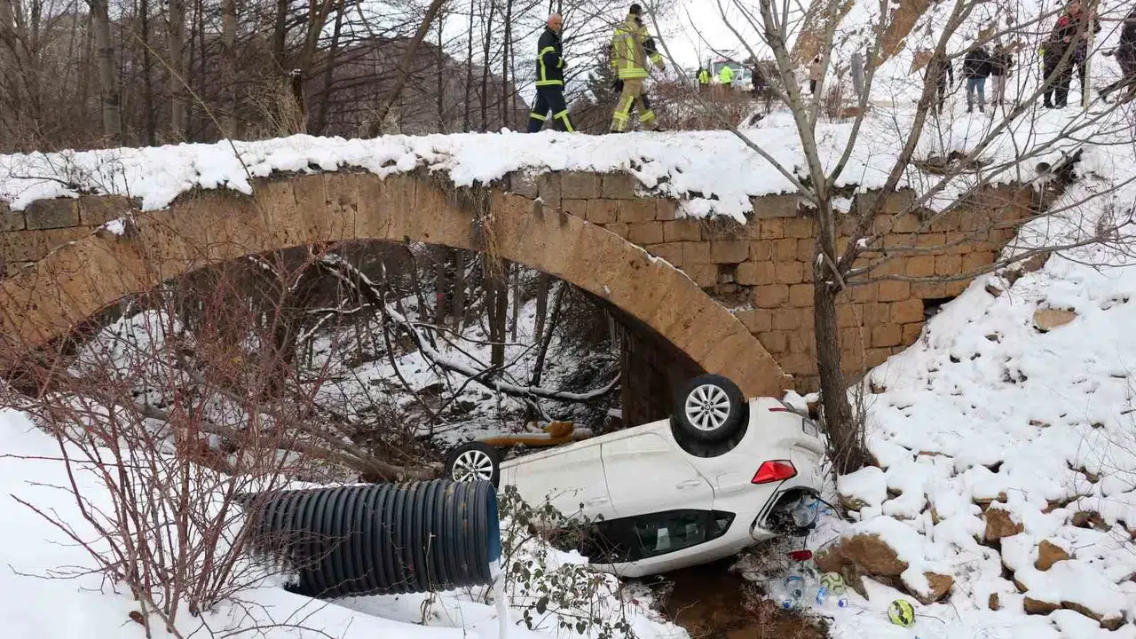 Edinilen bilgiye göre, 29 AAJ 723 plakalı Seat marka otomobiliyle tarihi Süleymaniye Mahallesi’nden Gözeler köyü istikametine ilerleyen Okan Demir (31), Kırkpavli mevkiindeki tarihi köprüye geldiğinde buzlu yolda aracının direksiyon hakimiyetini kaybetti. Virajı alamayan araç köprüden aşağıya uçtu. Dere yatağına ters dönerek düşen otomobilde bulunan sürücü Demir ve arkadaşı Kaan Çevik (24), kendi imkanlarıyla araçtan çıktı. İhbar üzerine gelen 112 Acil Sağlık ekipleri tarafından ilk müdahalesi olay yerinde yapılan Demir ve Çevik, Gümüşhane Devlet Hastanesinde tedavi altına alındı. Yaralıların sağlık durumlarının iyi olduğu öğrenildi.