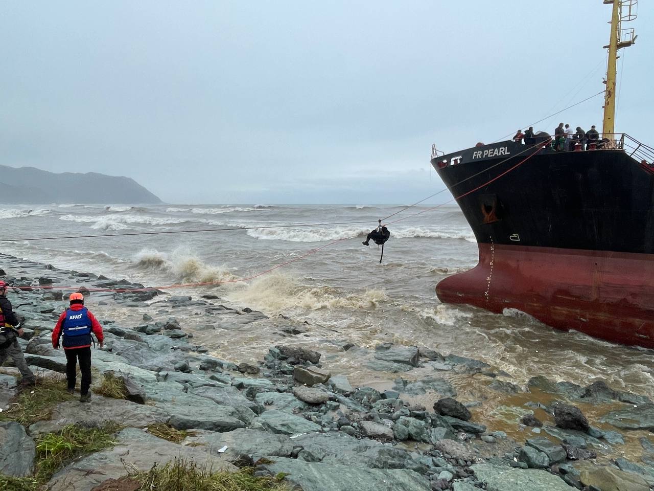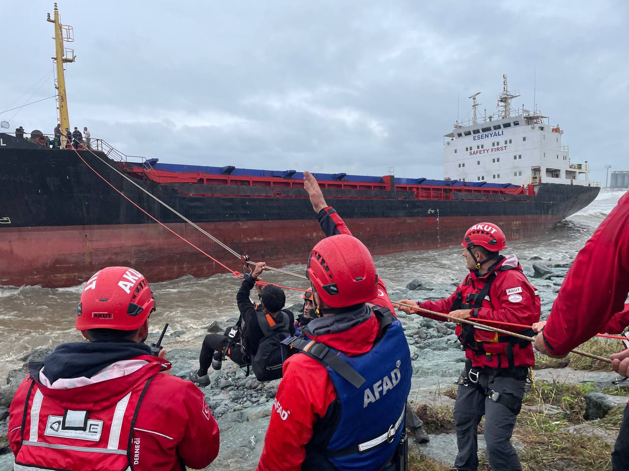 Mürettebat, gemiyle kara arasında kurulan zipline (iki nokta arasında çelik halatlar ve makara üzerinden, kullanıcıların emniyet kemeriyle bir noktadan diğer noktaya kayması) sistemiyle kıyıya çıkarıldı.