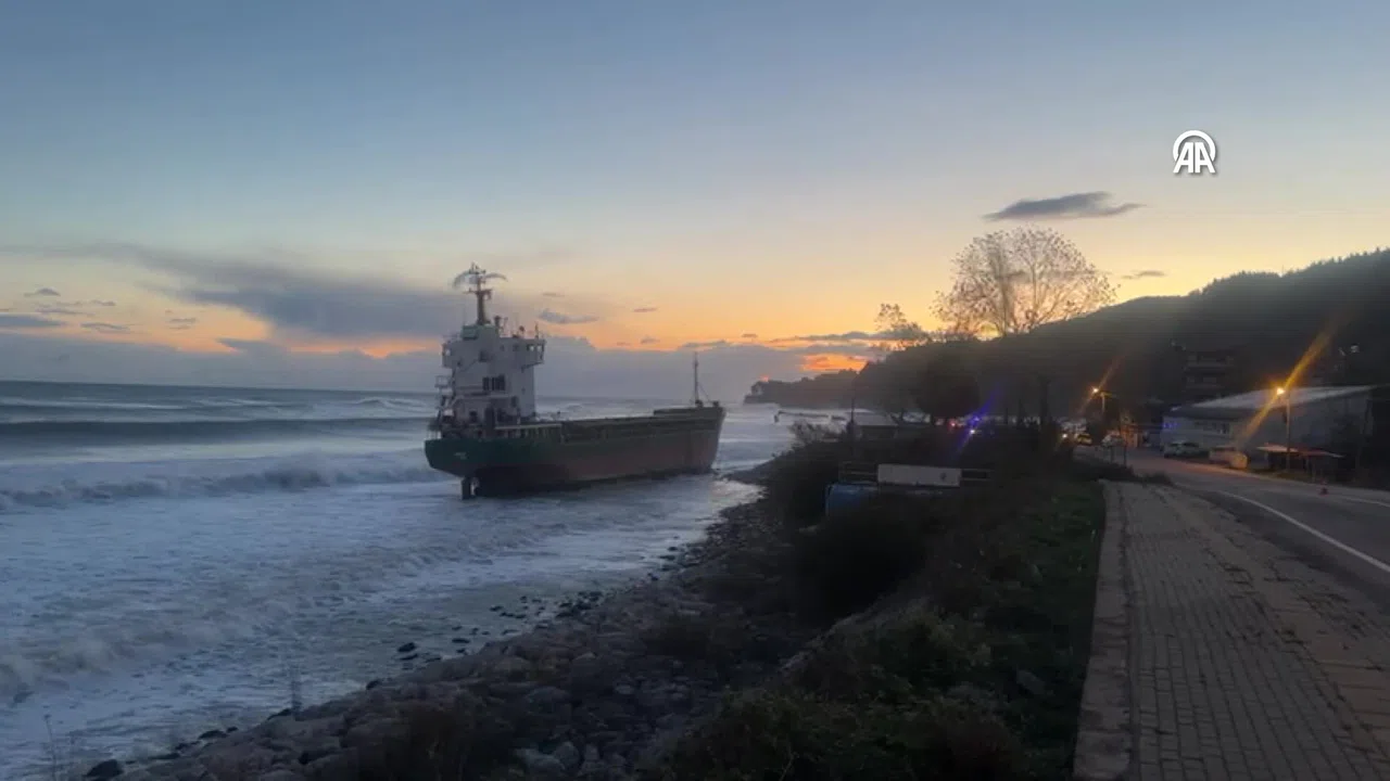 İnebolu ilçesinde fırtına nedeniyle Kamboçya bayraklı "Vamos" adlı kuru yük gemisi kıyıya sürüklendi.