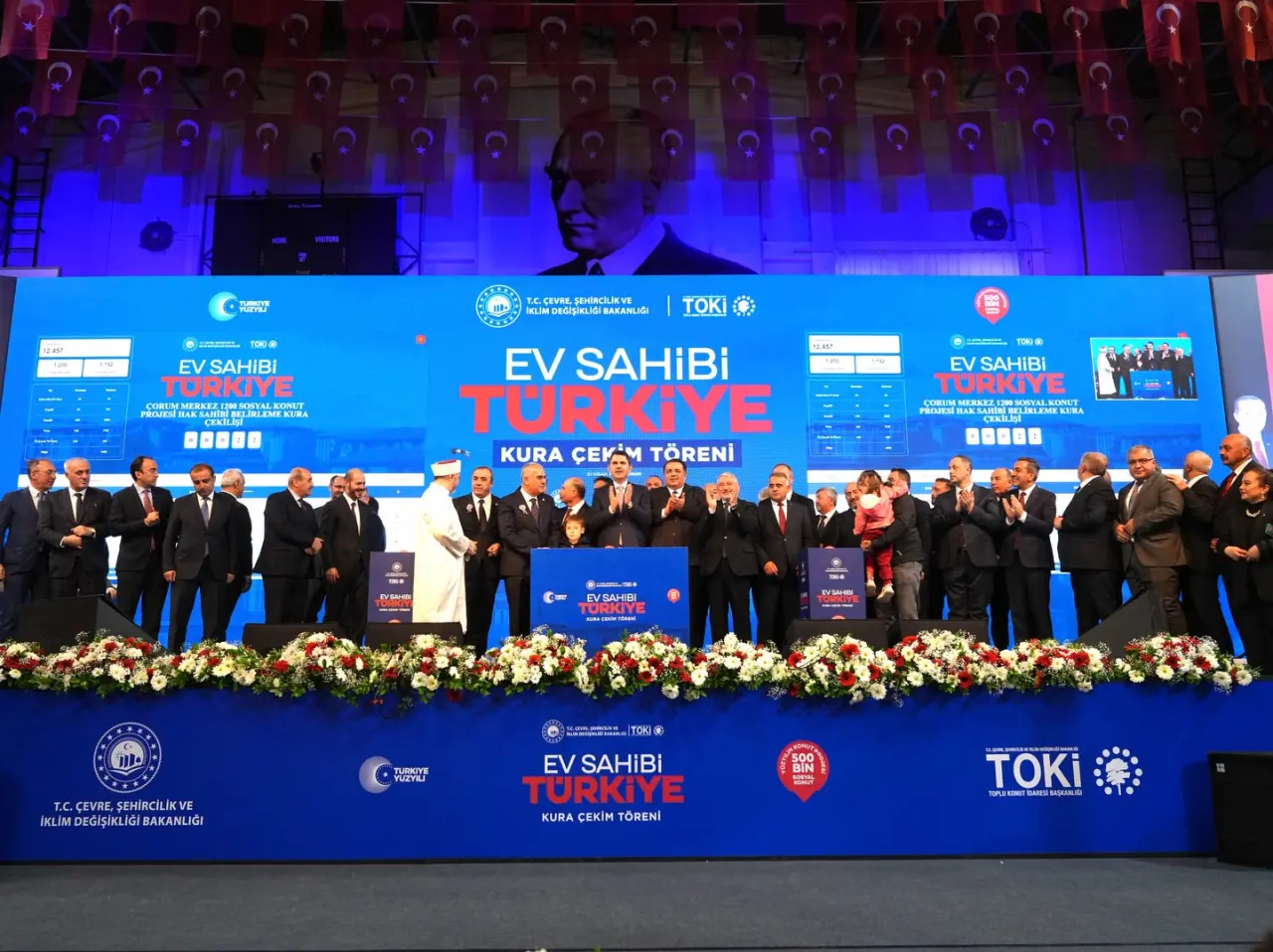 Çevre, Şehircilik ve İklim Değişikliği Bakanlığı tarafından 81 ilde hayata geçirilen “Ev Sahibi Türkiye” Projesi kapsamında Çorum’da yapılacak 2 bin 867 konutun kura çekilişi yapıldı. Atatürk Spor Salonu’nda yapılan törene, Çevre, Şehircilik ve İklim Değişikliği Bakanı Murat Kurum, Çorum Valisi Ali Çalgan, AK Parti Çorum Milletvekilleri Av. Yusuf Ahlatcı ve Av. Oğuzhan Kaya, MHP Genel Sekreter Yardımcısı ve Çorum Milletvekili Vahit Kayrıcı, TOKİ Başkanı Levent Sungur Belediye Başkanı Dr. Halil İbrahim Aşgın, Hitit Üniversitesi Rektörü Prof. Dr. Ali Osman Öztürk, daire müdürleri, siyasi parti temsilcileri, kamu kurum ve kuruluşların temsilcileri, sivil toplum kuruluşlarının temsilcileri ile vatandaşlar katıldı.