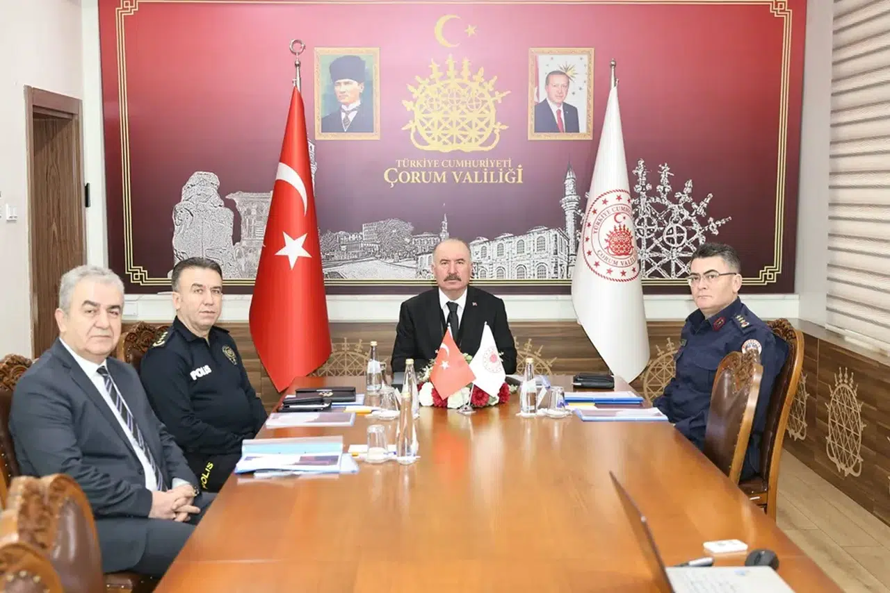 Toplantıda Vali Ali Çalgan’ın yanı sıra Çorum’un güvenlik ve göç yönetiminden sorumlu üst düzey yetkilileri de hazır bulundu. İl Emniyet Müdürü Arif Pehlivan, İl Jandarma Komutanı Jandarma Kıdemli Albay Kubilay Ayvaz ve Çorum İl Göç İdaresi Müdürü İdris Coşkun’un katılımıyla gerçekleştirilen görüşmelerde, sahadaki uygulamalar ve kurumlar arası iş birliğinin önemi vurgulandı.