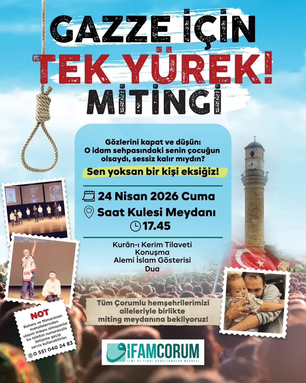 Çorum İlmi ve Fikri Araştırmalar Merkezi Vakfı Şube Başkanı Mehmet Polat Gazze'deki insanlık dramını gündemde tutmak ve işgal altındaki topraklara dikkat çekmek amacıyla 24 Nisan Cuma günü Saat Kulesi meydanında miting düzenleyeceklerini duyurdu.