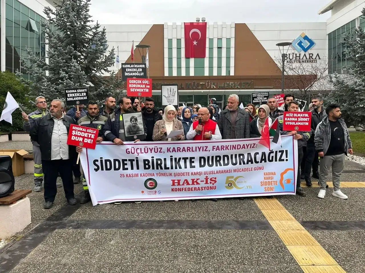 HAK-İŞ Konfederasyonu Çorum İl Başkanlığı, 25 Kasım Kadına Yönelik Şiddete Karşı Uluslararası Mücadele Günü dolayısıyla Buhara Kültür Merkezi önünde düzenlediği basın açıklamasında, şiddetin her türlüsüne karşı olduklarını 81 ille eş zamanlı olarak haykırdı.