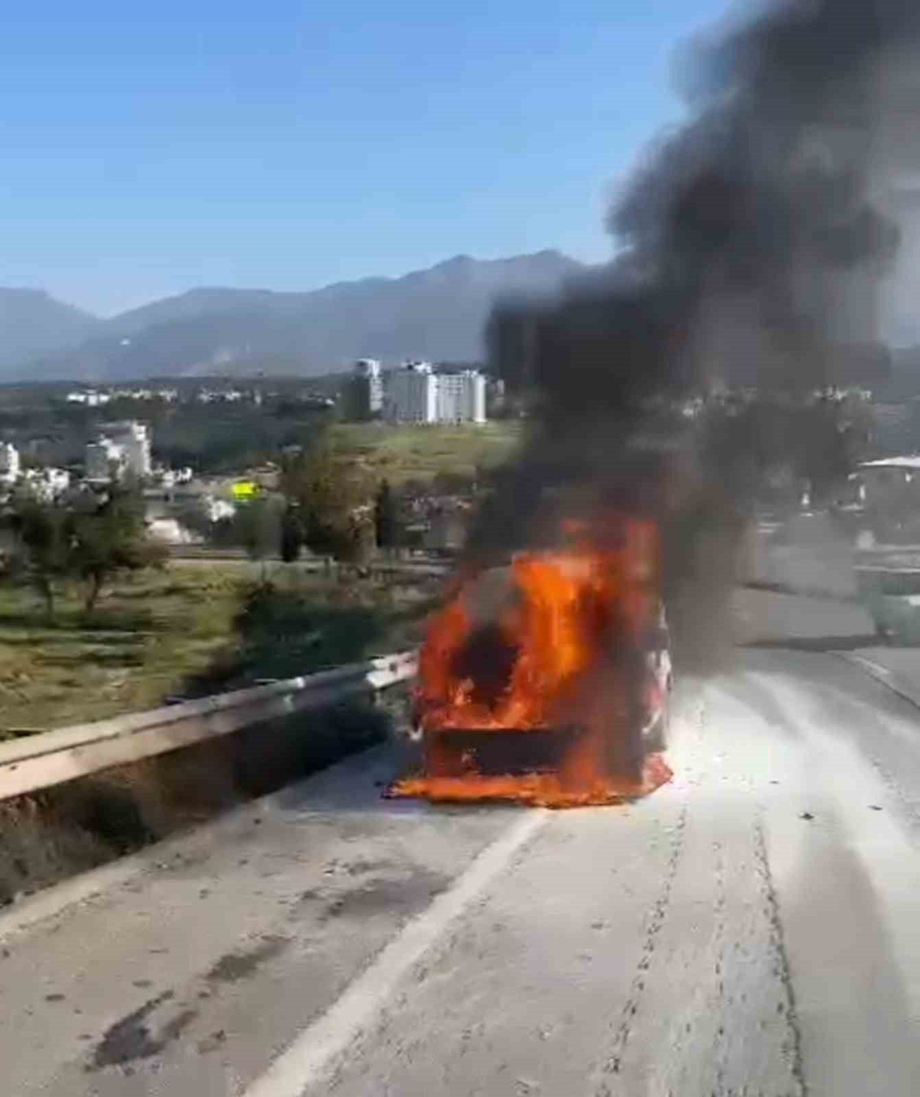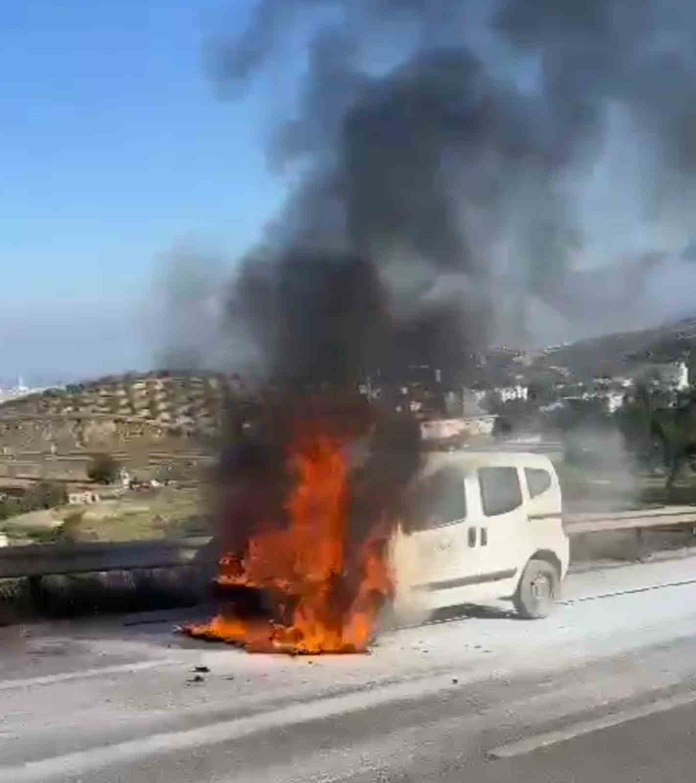 Hatay’da seyir halindeki hafif ticari aracın alev aldığı anlar kameraya yansıdı.