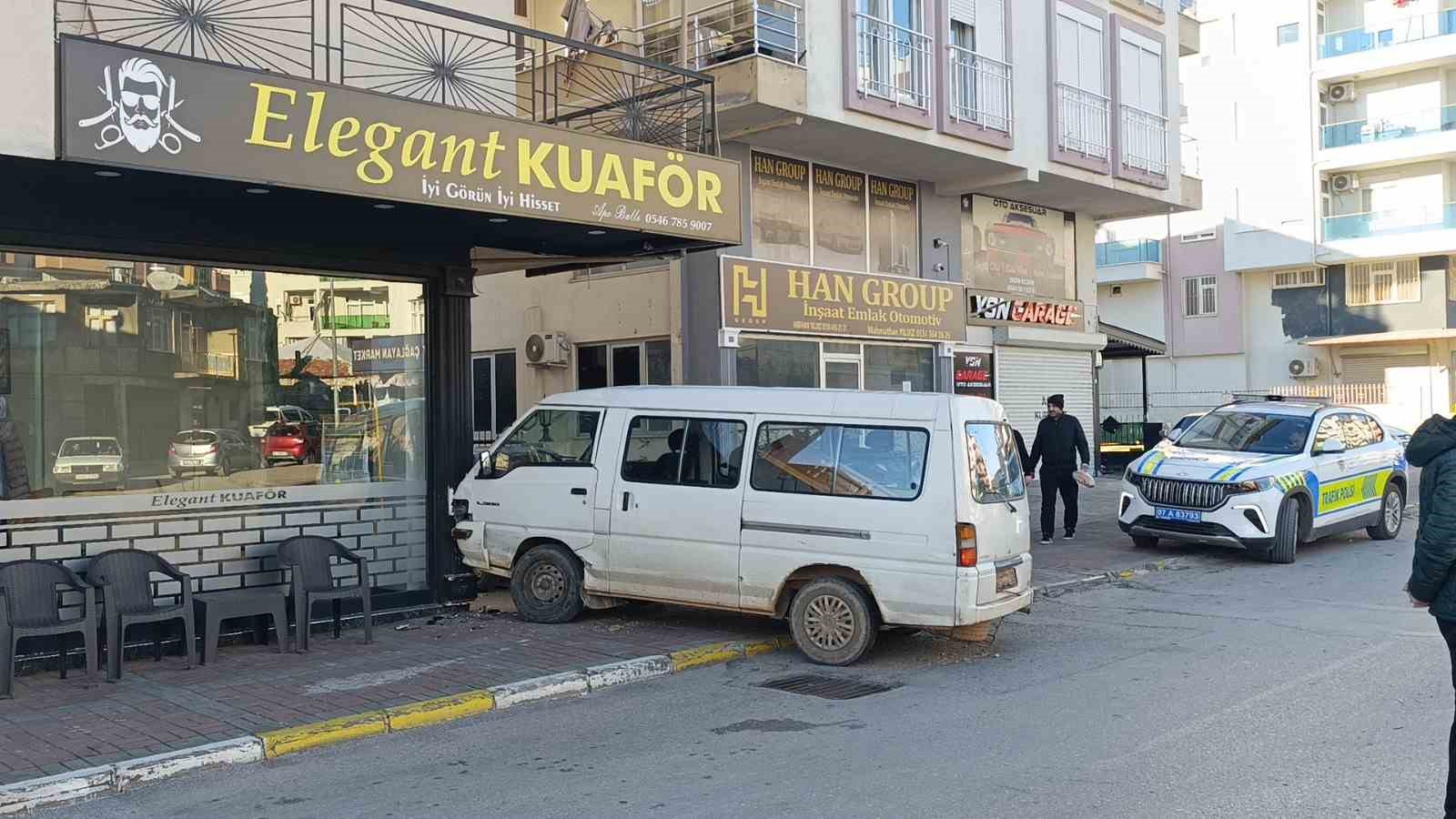 Manavgat’ta hafif ticari araç ile çarpışan kapalı kasa kamyonet, kazanın şiddetiyle yolun karşısındaki kuaförün duvarına çarparak durabildi.