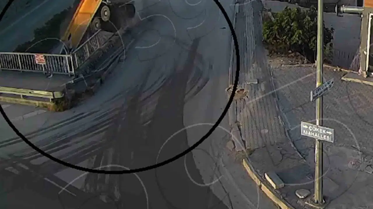 Hatay’da yola dökülen sıvının etkisiyle sürücüsünün direksiyon hakimiyetini kaybettiği hafriyat kamyonunun 5 metrelik duvardan uçtuğu anlar kameraya yansıdı.