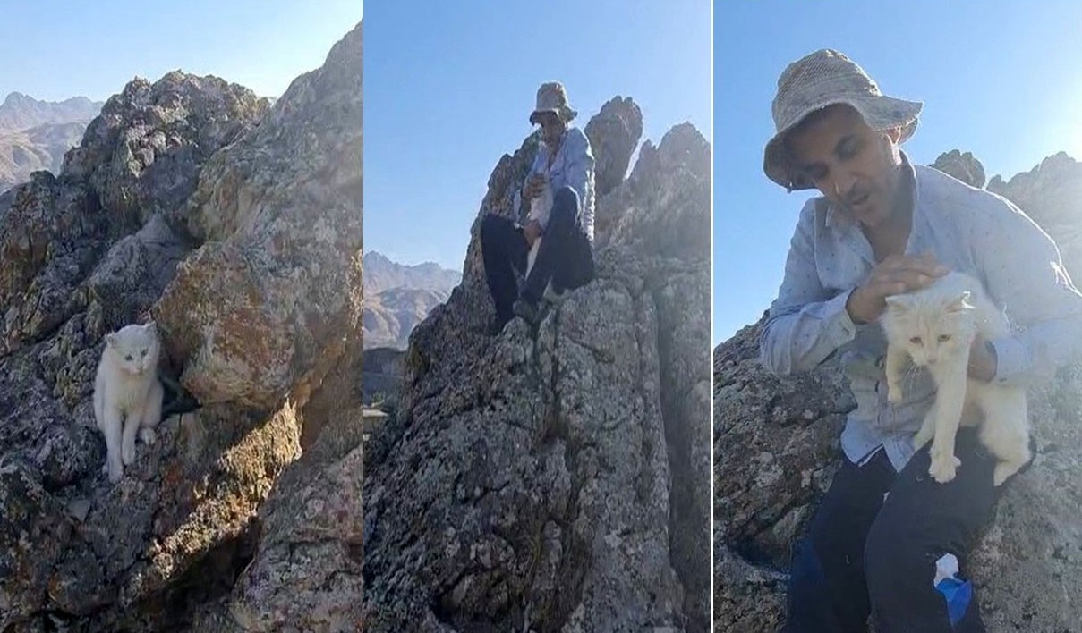 Hakkari’de 250 metre yüksekliğindeki kayalıklarda 2 gündür mahsur kalan kedi, duyarlı bir vatandaş tarafından kurtarıldı.