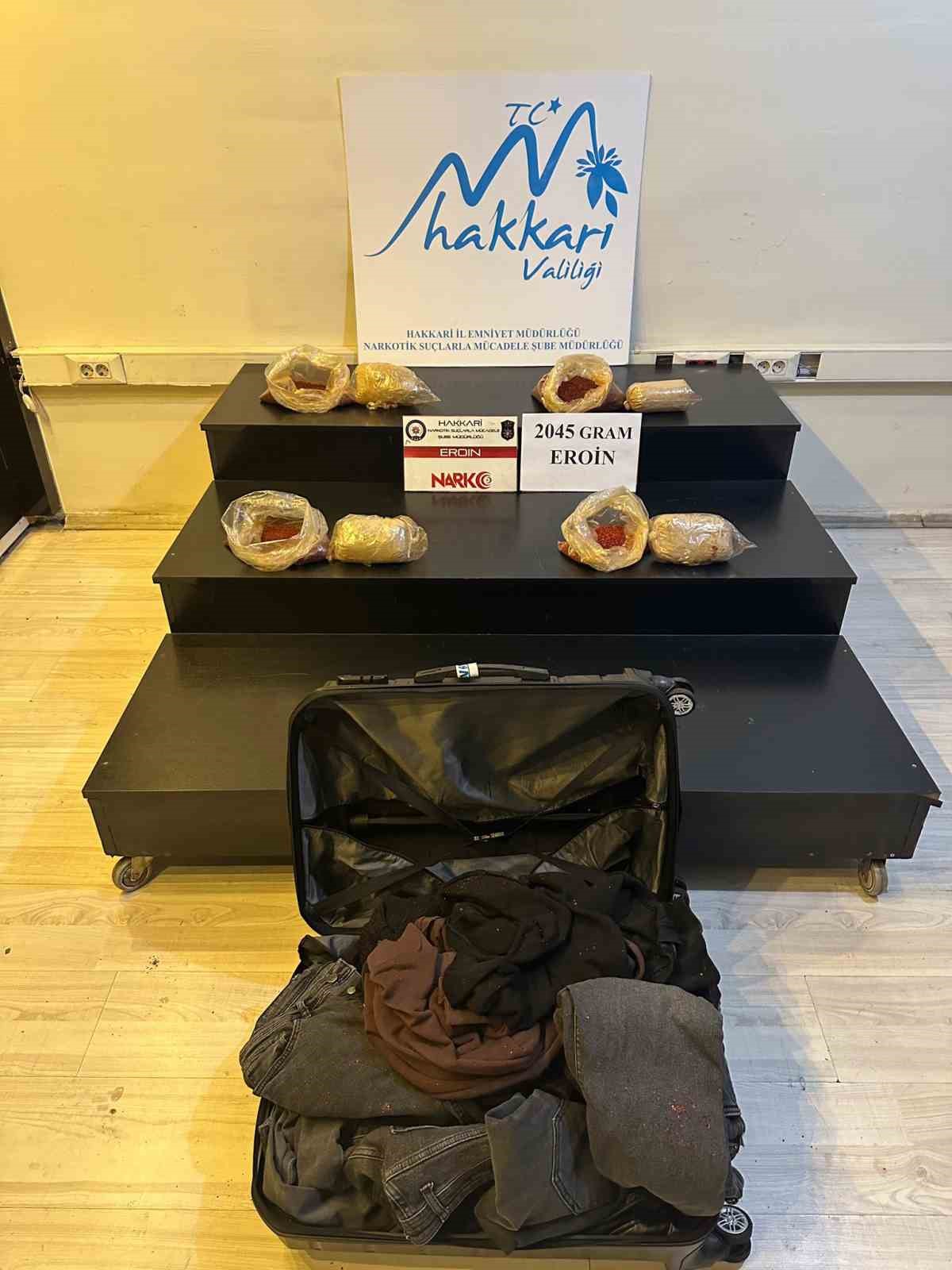 Hakkari Valiliğinden yapılan açıklamada, “Hakkari İl Emniyet Müdürlüğü görevlilerimizce Yüksekova ilçemizde yapılan rutin kontrollerde narkotik madde arama köpeği Fox ile bir yolcu otobüsünde arama yapıldı. Yapılan aramada 2 şahsın valizinde şeffaf pul biber poşetlerinin içine gizlenmiş vaziyette 4 ayrı paket halinde daralı ağırlığı 2 kilo 45 gram olan eroin maddesi ele geçirildi. Olayla ilgili gözaltına alınan 2 şahıs, emniyetteki sorgularının ardından çıkarıldıkları adli makamlarca tutuklandı” denildi.