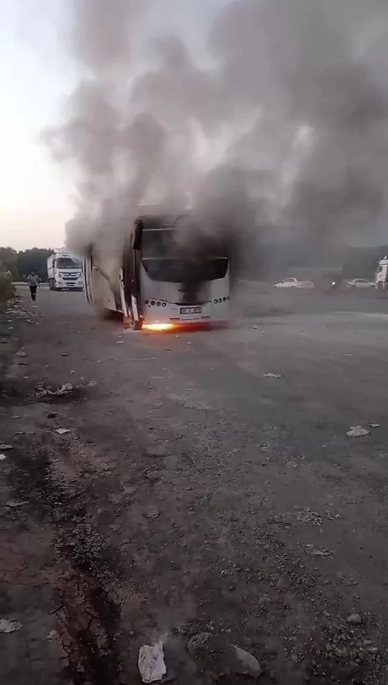Hatay’da işçileri taşıyan servis minibüsü seyir halindeyken alev aldı, o anlar cep telefonu kamerasına yansıdı.