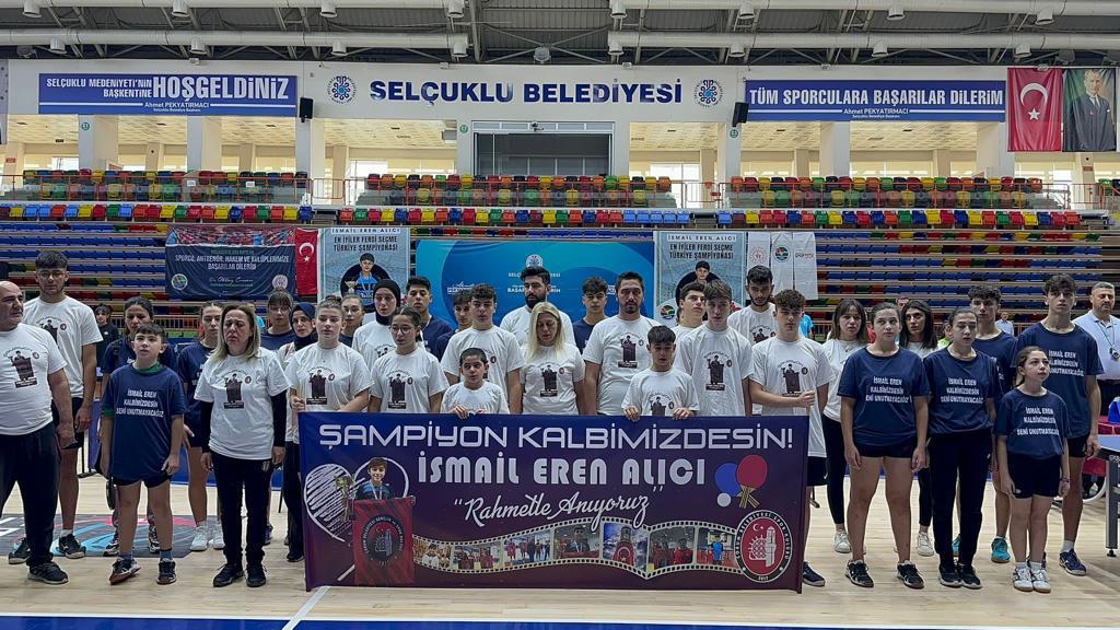 Konya’da 13-15 Ekim 2023 tarihleri arasında gerçekleşecek olan İsmail Eren Alıcı En İyiler Ferdi Seçme Türkiye Şampiyonası (Yıldız-Genç) müsabakalarının açılışı yapıldı.  Müsabaka öncesinde İsmail Eren Alıcı adına anma töreni gerçekleştirildi. Saygı duruşu ve istiklal marşının okunmasının ardından Türkiye Masa Tenisi Federasyonu tarafından İsmail Eren’in annesi Nilgün Alıcı’ya plaket takdim edildi. Öte yandan İsmail Eren adına basılan tişörtleri giyerek törene katılan arkadaşları ve antrenörler salonda duygusal anlar yaşattı. (Sümeyra Özdoğan)