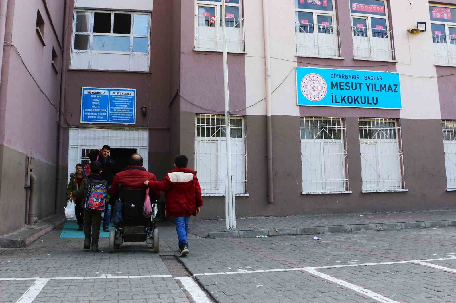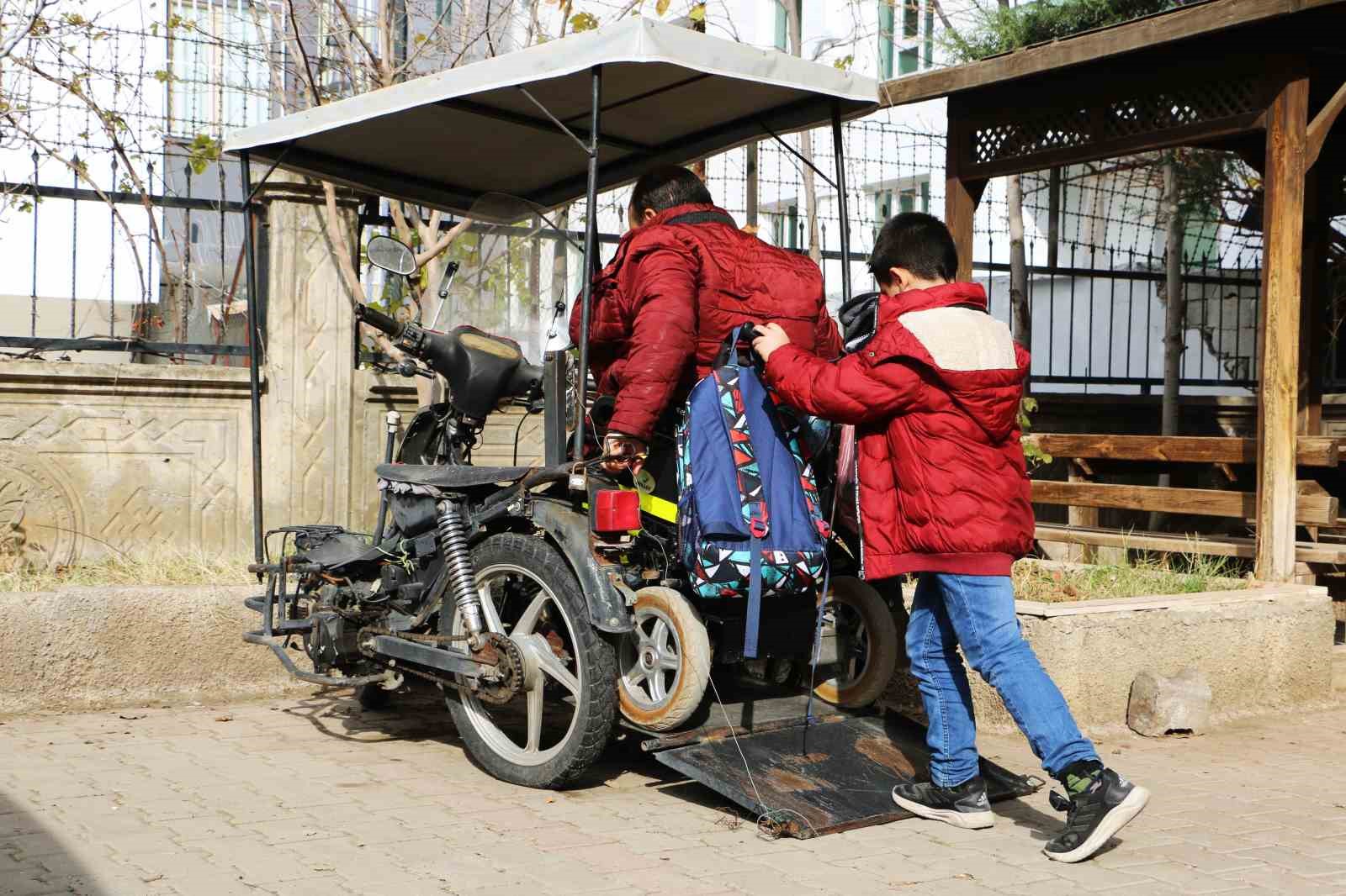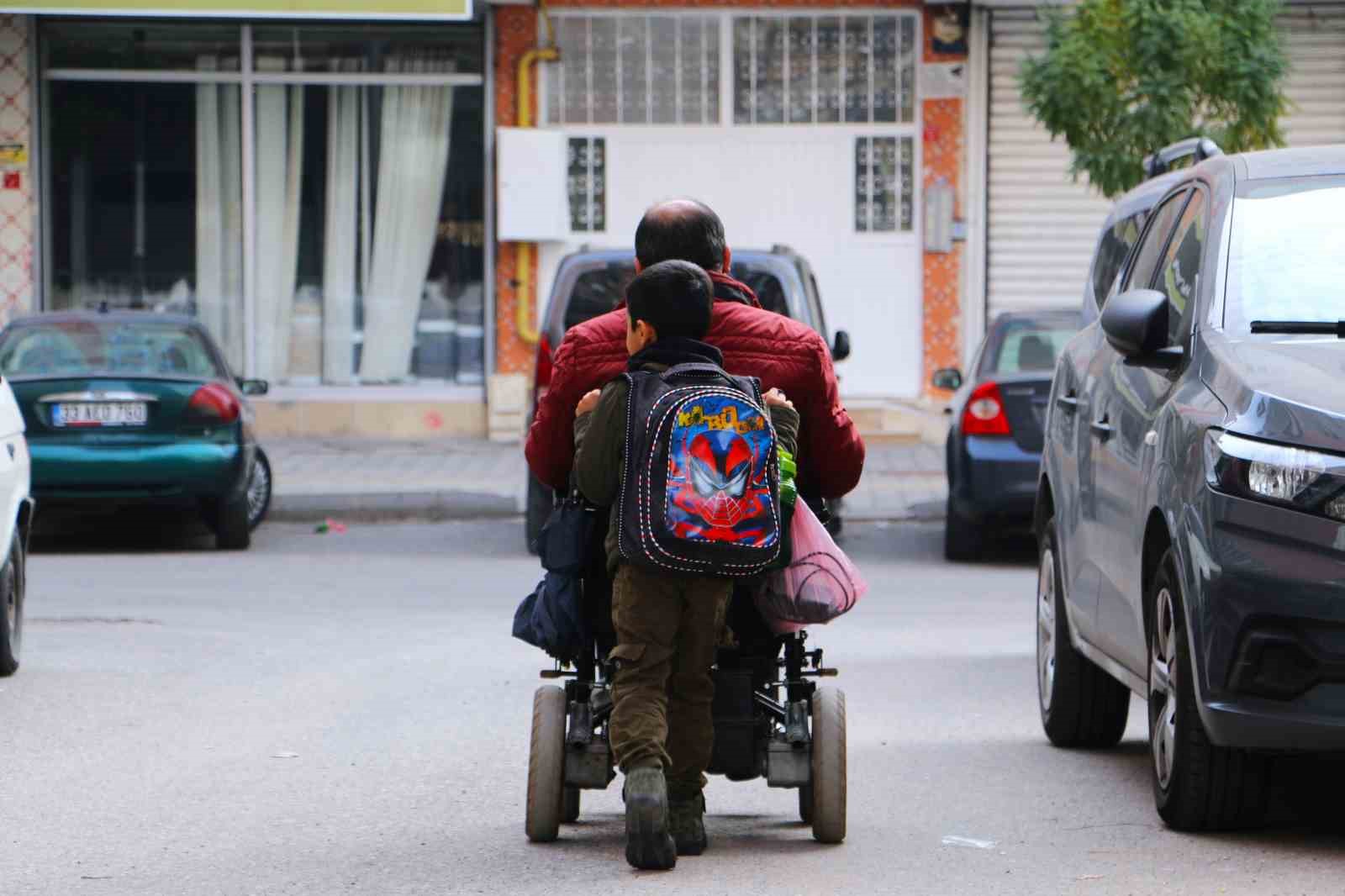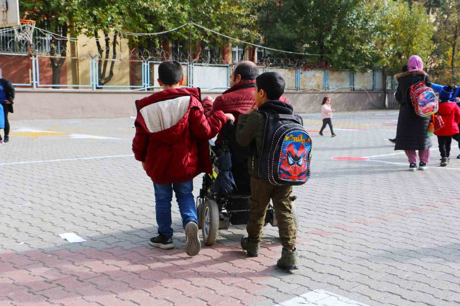 4 çocuğundan 4. sınıf öğrencisi Beytullah ve 1. sınıf öğrencisi Emrullah’ı her gün akülü sandalyesiyle okula götürüp getiren Güngür, yürekleri ısıtan görüntülerle örnek davranış sergiliyor.