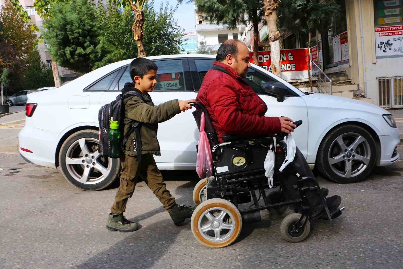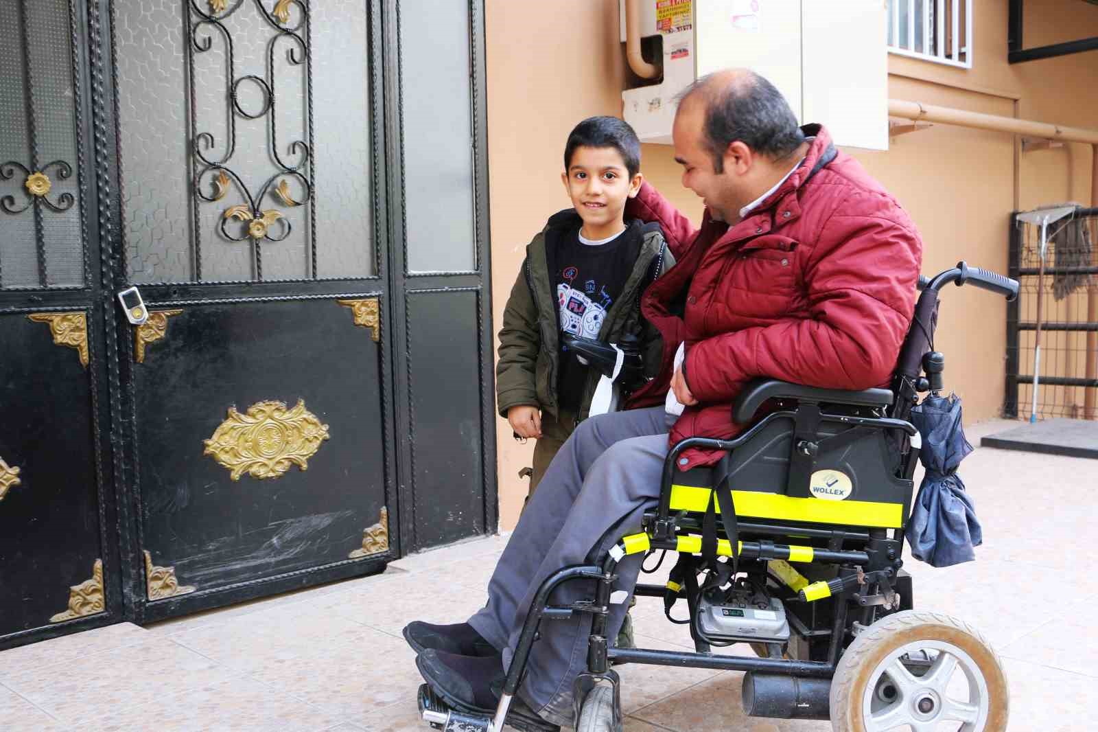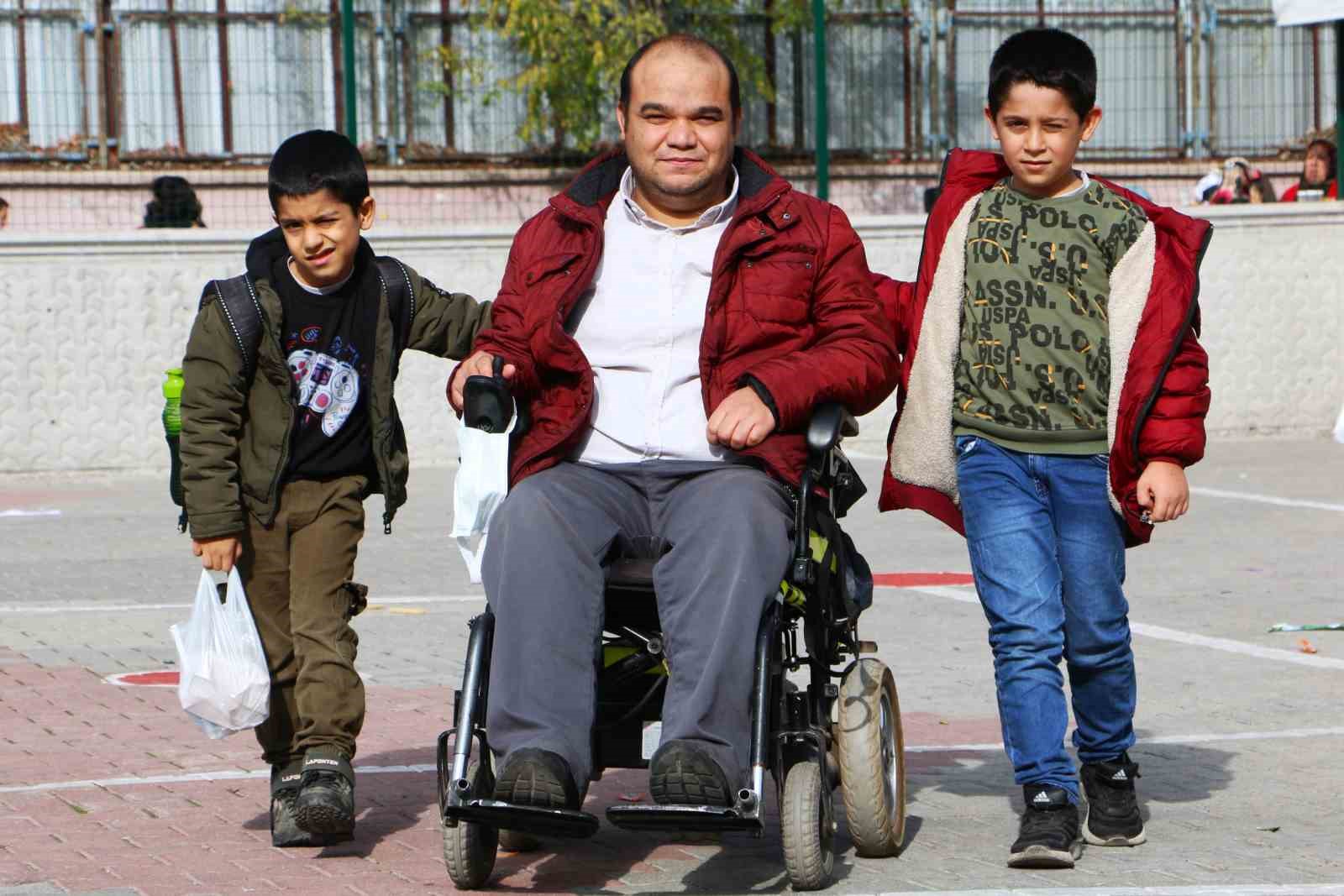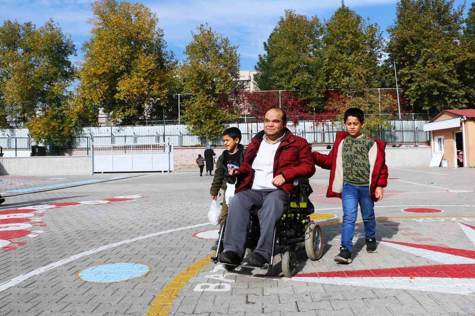 4 çocuğundan 4. sınıf öğrencisi Beytullah ve 1. sınıf öğrencisi Emrullah’ı her gün akülü sandalyesiyle okula götürüp getiren Güngür, yürekleri ısıtan görüntülerle örnek davranış sergiliyor.
