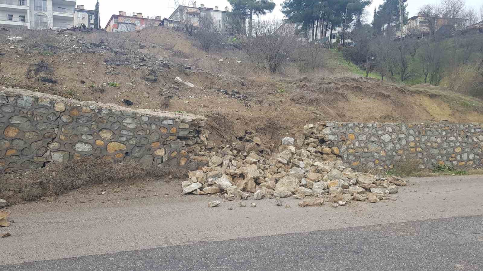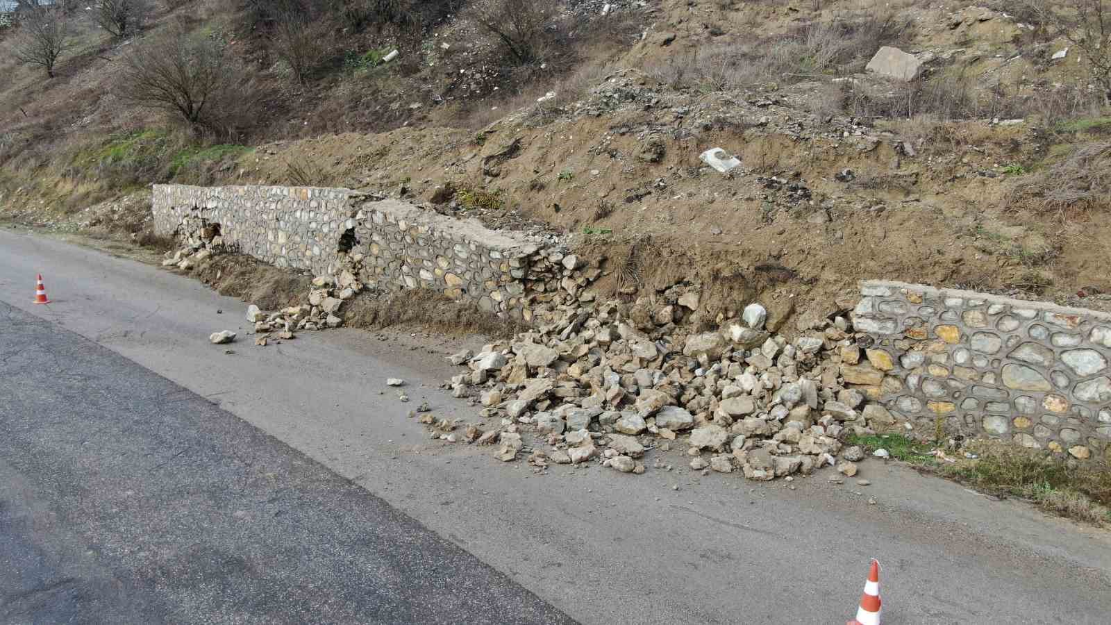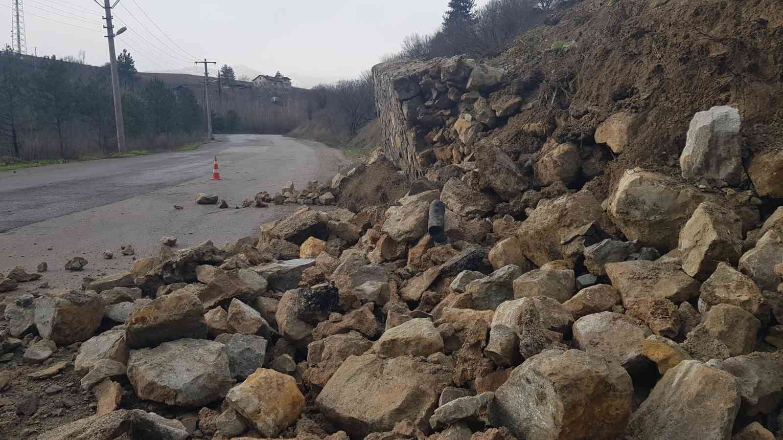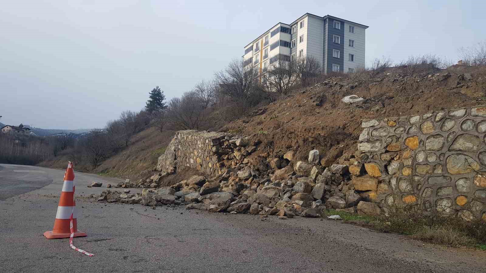 Karabük’te heyelan sonrası çekilen istinat duvarı etkili olan sağanak ve kar yağışı sonrası toprak kaymasına dayanamayarak çöktü.