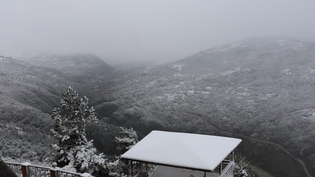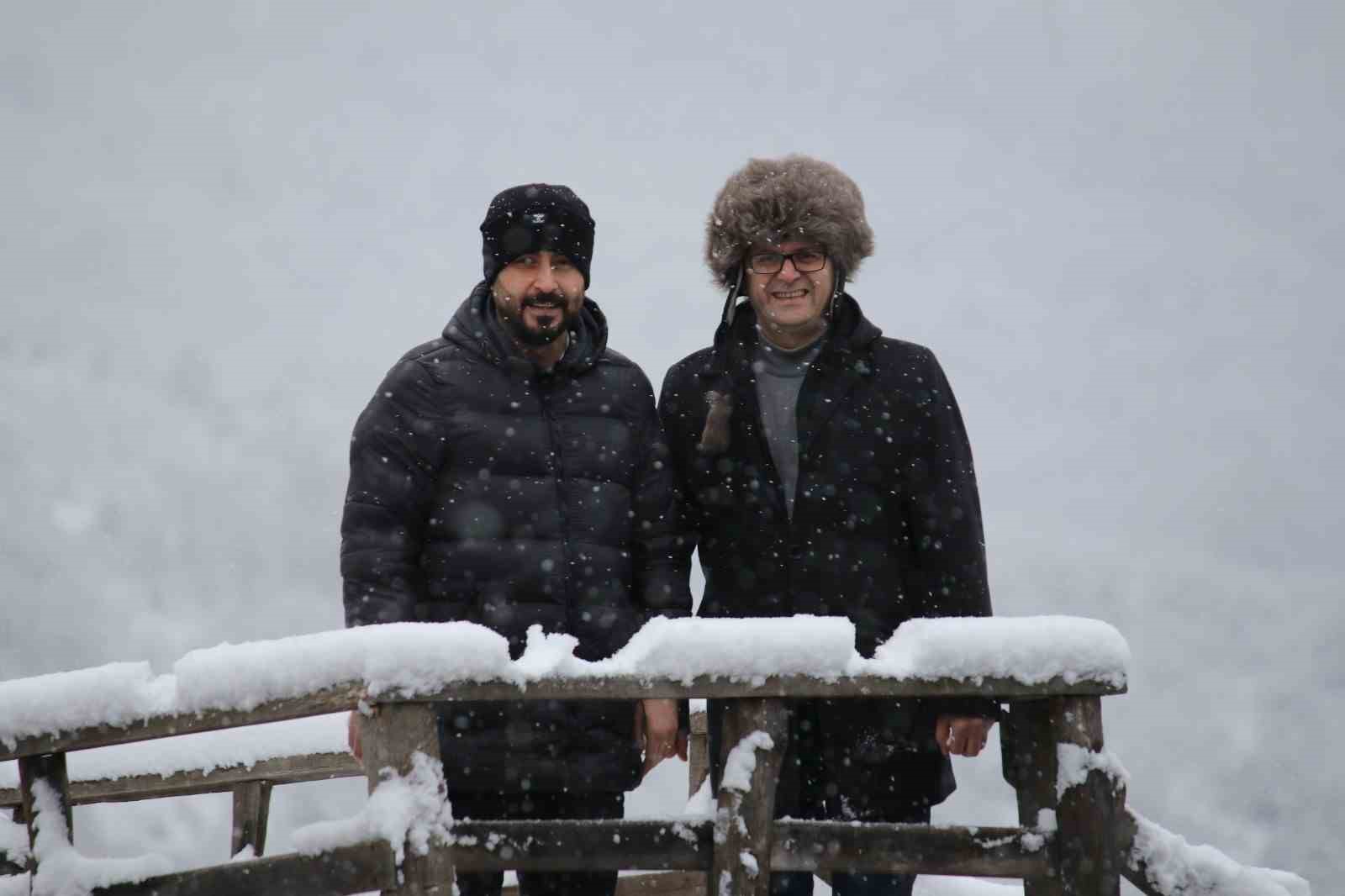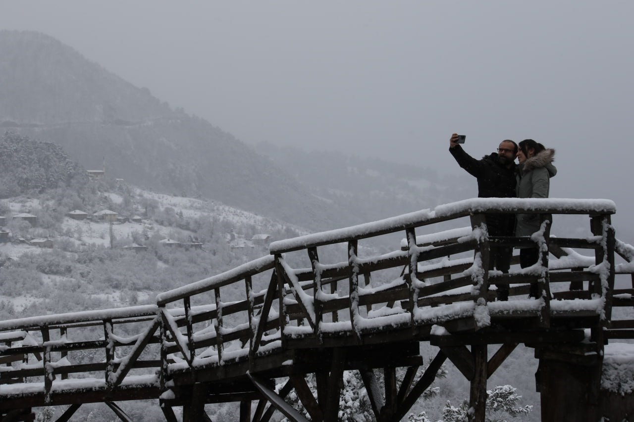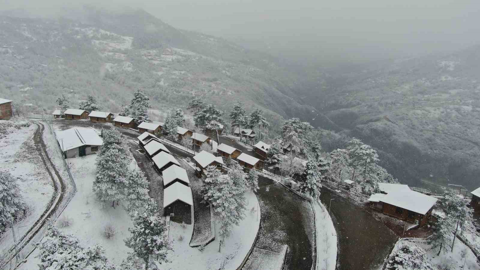 Karabük’ün Yenice ilçesinde etkili olan kar yağışı sonrası beyaz gelinliğini giyen Ihlamur Terası, kartpostallık görüntüleri ile görenleri kendine hayran bıraktı.