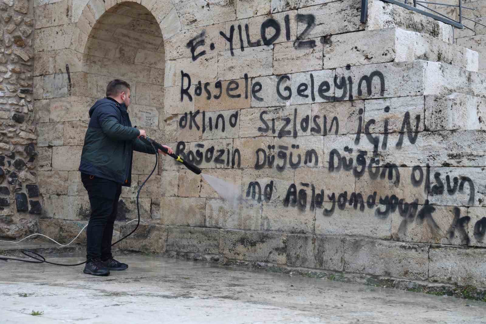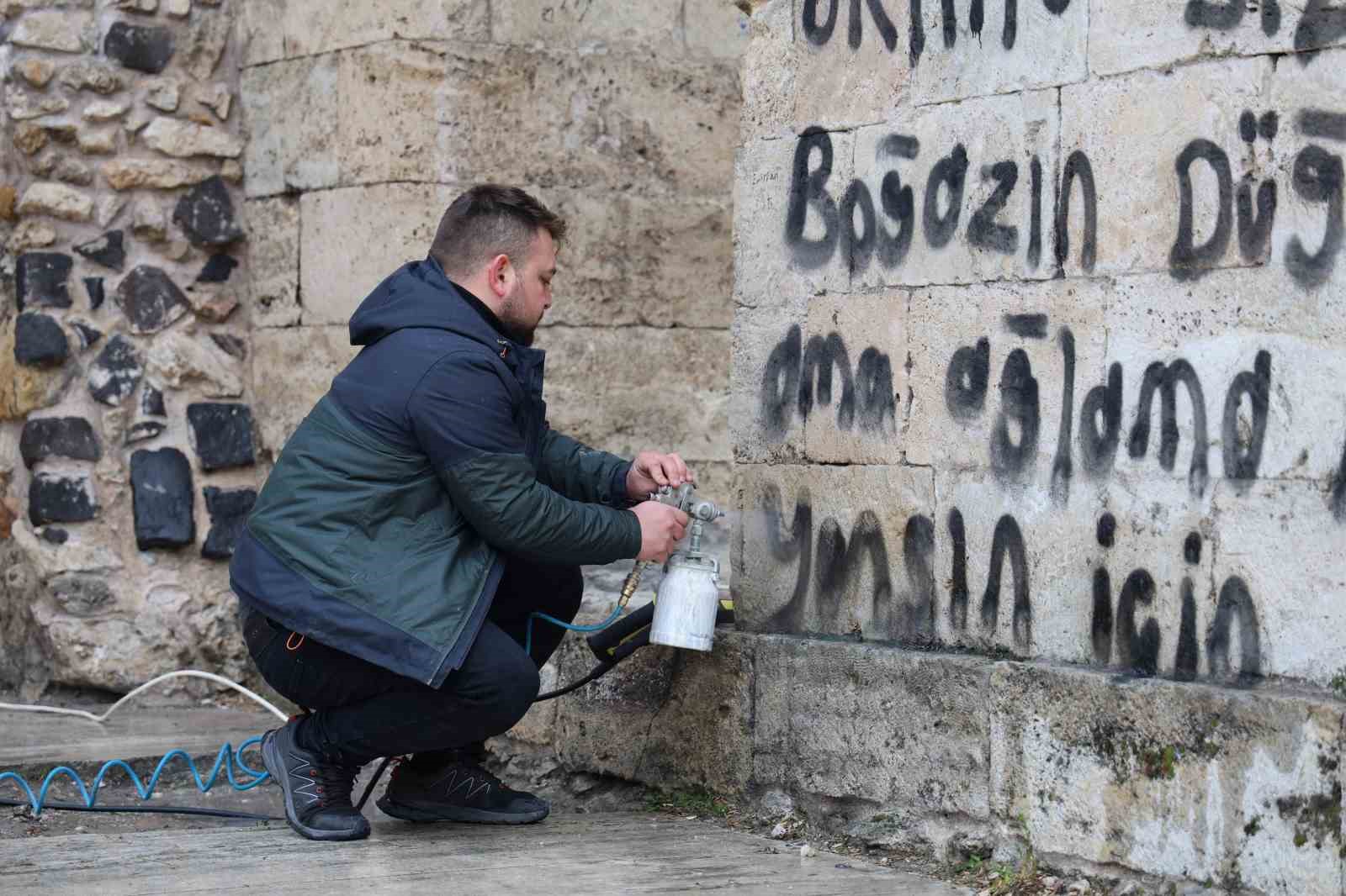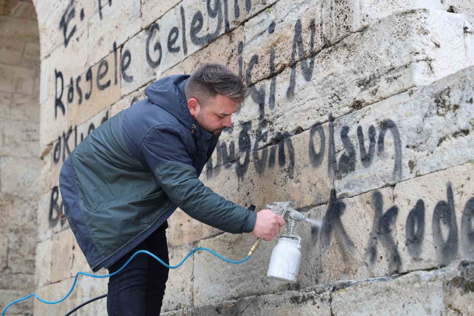 Konu ile ilgili açıklama yapan Vakıflar Bölge Müdürü Cemal Karaca, “Nesillerimizi eğer eserlerimizi korumak adına bir kültürle yetiştirmezsek nesillerimiz ecdadımızın yapmış olduğu bu eserleri tahrip eder, kıymetini de bilmezler. Bundan dolayı sorun burada başlıyor. Sorun eğitimle ilgili. Çocuklar yakalandı, tespit edildi. Adliyeye müracaat edildi ama bunlar çözüm değil. Çözüm kökten, herkesin bu eserleri koruması ve kollaması lazım. Biz yıllardır bir sıkıntı içerisindeydik. Bu duvarlara yapılan yazıların silinmesi baya masraflı ve sıkıntılıydı. Şimdi daha kolay bir çözüm yolu bulundu. Oda inşallah Türkiye’ye böylece yayılır. Taşı önceden ıslatıp, çürümesine engel olacak şekilde boya çürütme malzemesi kullanılarak şuanda bu işlem eserimizi tekrar temize çıkarıp kullanılır ve istifa edilebilir hale getirecektir” ifadelerini kullandı