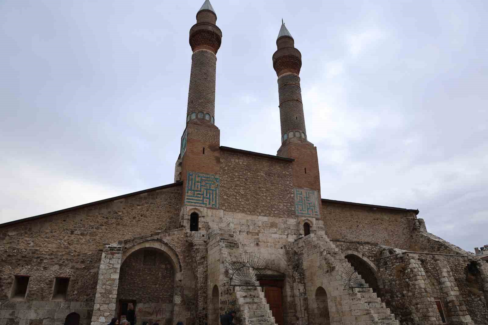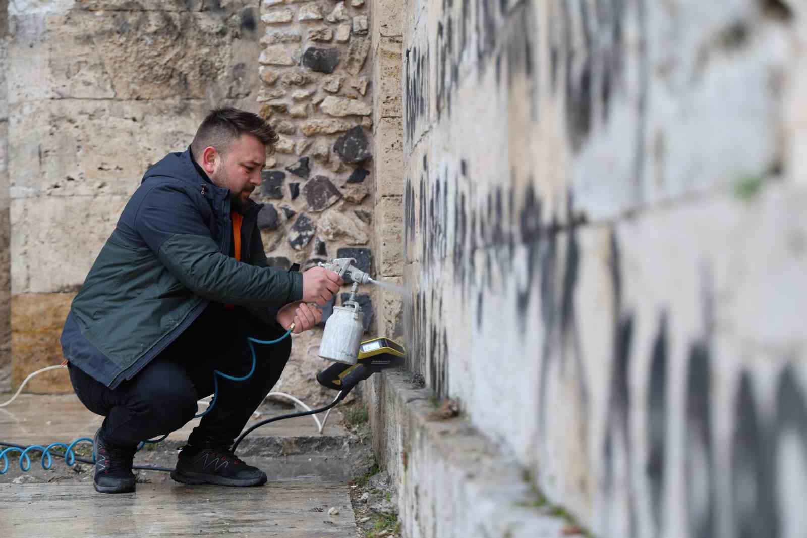 Sivas’ın simgelerinden biri olan 752 yıllık tarihi Çifte Minareli Medrese’nin üzerine yazılan yazılar, boya çürütme tekniği ile temizlendi.