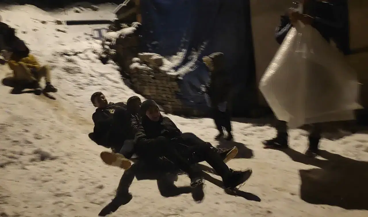 Oğuzlar’da yılın son akşamında mahalle aralarında bir araya gelen çocuklar, evlerinden getirdikleri çöp poşetleri ve leğenlerle kayarak karın tadını çıkardı.