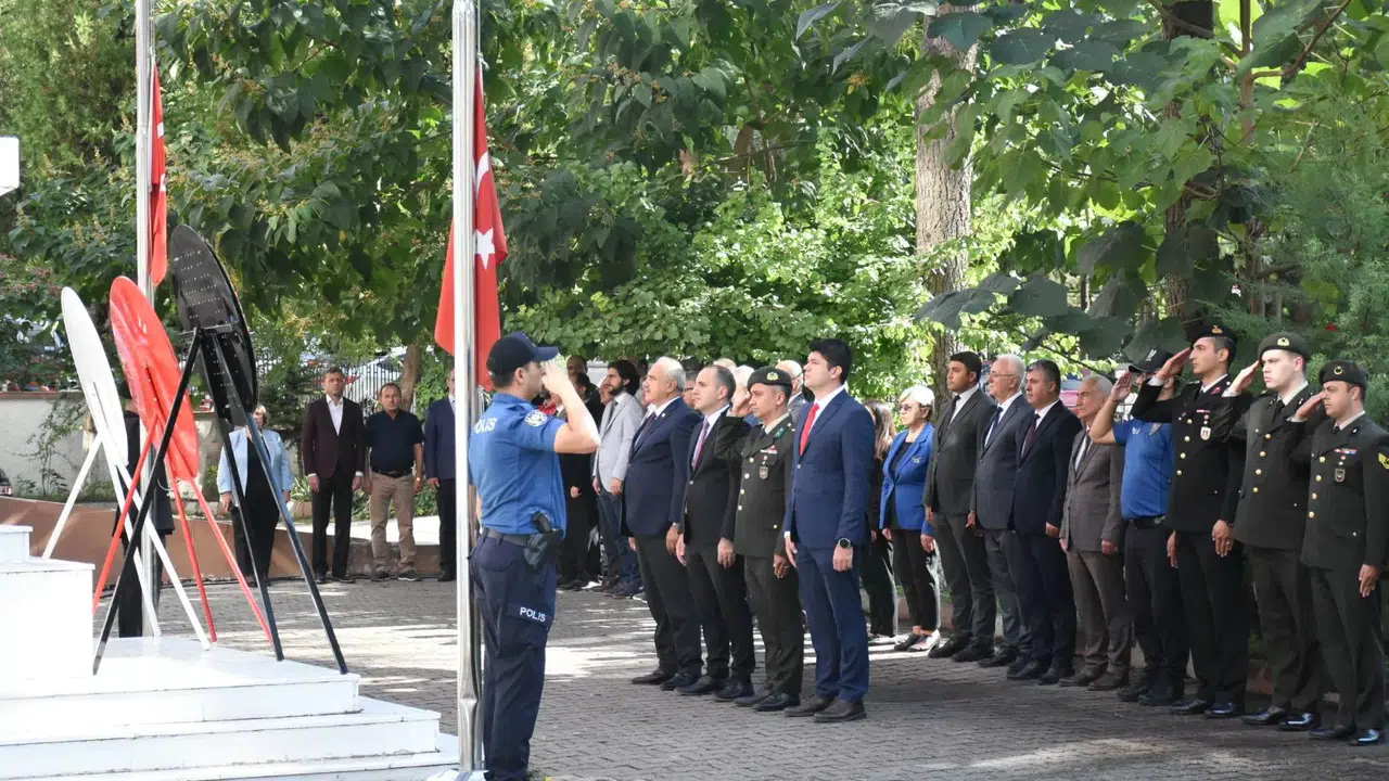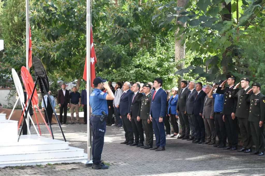 Törende Kaymakam Polat, Belediye Başkanı İsmail Çizikci, Garnizon Komutanı Piyade Üsteğmen Adem Gökkuş, Cumhuriyet Savcısı Yasin Onur Ayhan, İlçe Emniyet Müdürü Önder İstanbul, İlçe Jandarma Komutanı Jandarma Üsteğmen Hakan Güven ve diğer katılımcılar, saygı duruşunda bulunduktan sonra İstiklal Marşı'nı okudu.