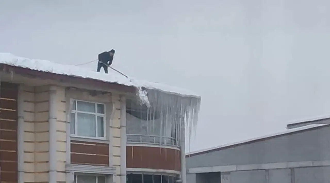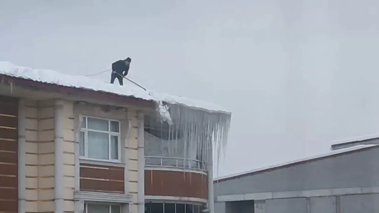 Bitlis’in Tatvan ilçesinde etkili olan kar yağışının ardından çatılarda biriken kar yığınlarını bellerine bağladıkları iple temizleyen ev sahipleri, tehlikeye adeta meydan okuyor.