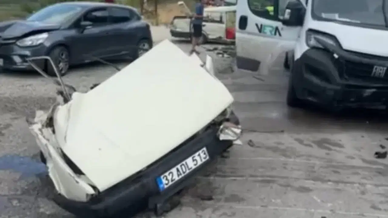 Isparta-Antalya Karayolu’nda 1 panelvan araç ile 2 otomobilin çarpışması sonucu bir otomobilin ortadan ikiye bölündüğü kazada 7 kişi yaralandı.