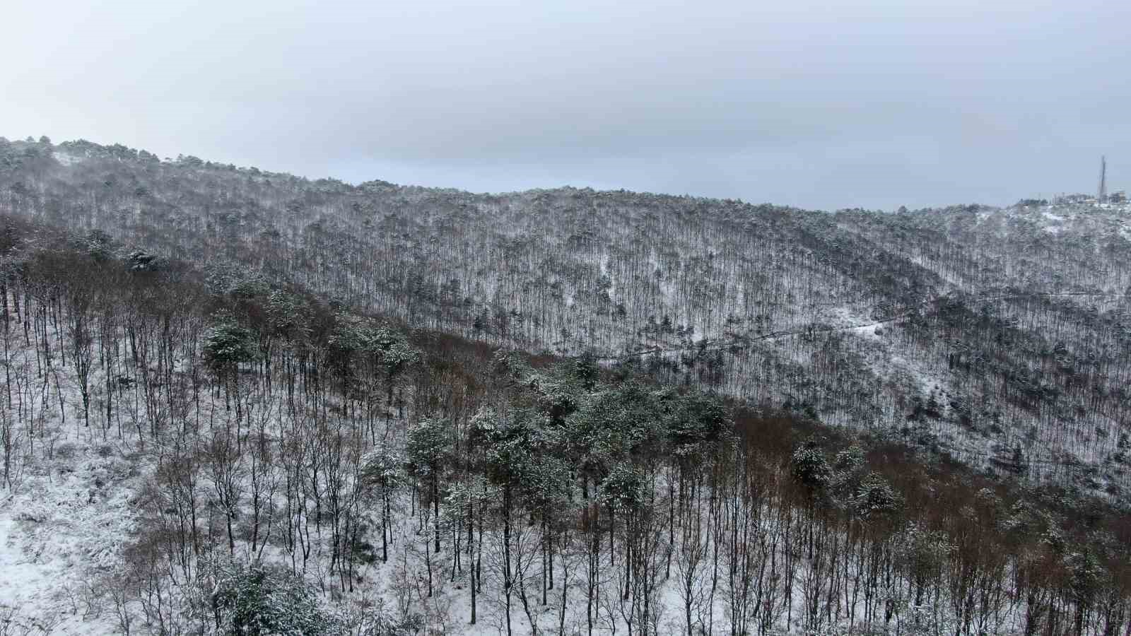 İstanbul’da kar yağışı şehrin yüksek kesimlerinde günün erken saatlerinden itibaren etkisini göstermeye başladı. Kar nedeniyle Aydos Tepesi çevresindeki ormanlık alan beyaza büründü, ortaya kartpostallık görüntüler çıktı.