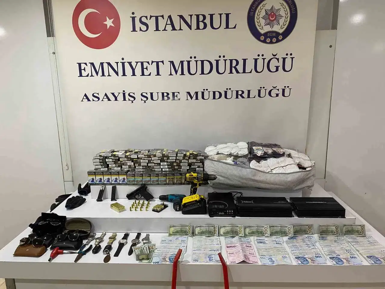Asayiş Şube Müdürlüğü Hırsızlık ve Yankesicilik Büro Amirliği ekipleri, 15 Kasım’dan itibaren kentin farklı bölgelerinde meydana gelen 14 otomobil konsolu, 11 iş yerinden hırsızlık, 8 otomobil ve 10 plaka hırsızlığına ilişkin çalışma başlattı. Kimlikleri belirlenen şüphelilerin yakalanmasına yönelik 19 Ocak’ta Avcılar, Esenyurt, Bayrampaşa, Zeytinburnu, Ümraniye, Güngören, Başakşehir, Sultangazi ve Küçükçekmece’de bulunan 14 adrese eş zamanlı operasyon düzenlendi. Adreslerde yapılan aramalarda ruhsatsız tabanca, 96 fişek, 3 çelik yelek, çalıntı olduğu değerlendirilen 3 araç ses sistemi, 5 gözlük, 6 kol saati, 335 paket sigara, tekstil ürünleri, bin 100 dolar ile 23 bin 700 lira ele geçirildi. Asayiş Şube Müdürlüğündeki işlemlerin ardından adliyeye sevk edilen 7 şüpheliden 6’sı tutuklanırken, 1 zanlı adli kontrol şartıyla serbest bırakıldı. Şüphelilerin hırsızlık anları ise çevredeki güvenlik kameralarınca görüntülendi.