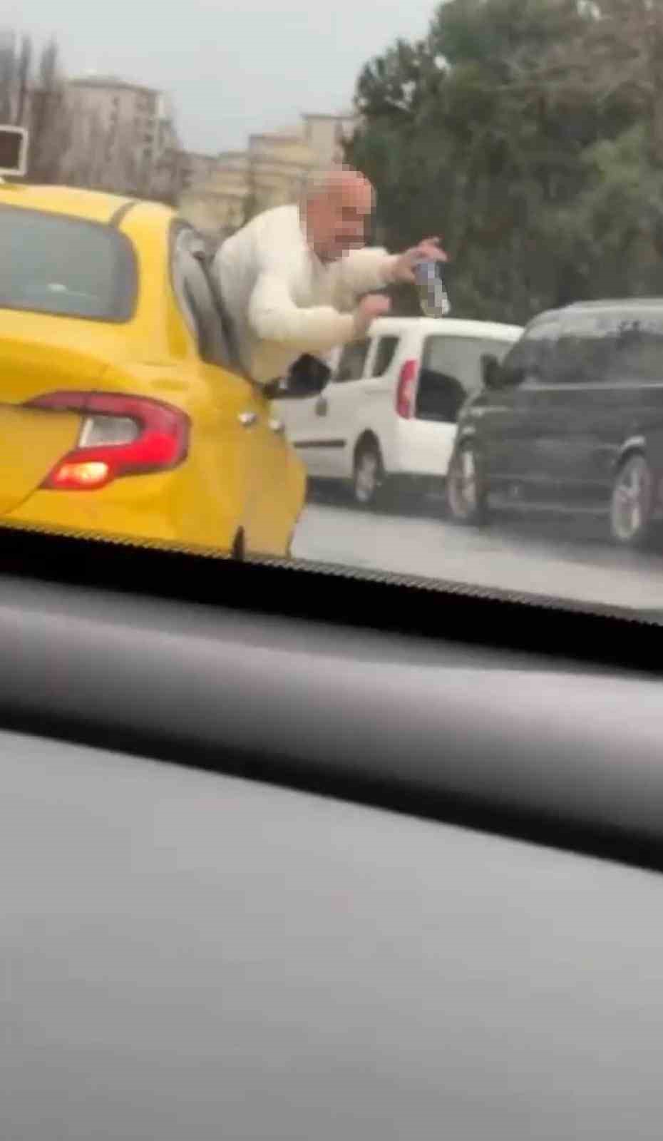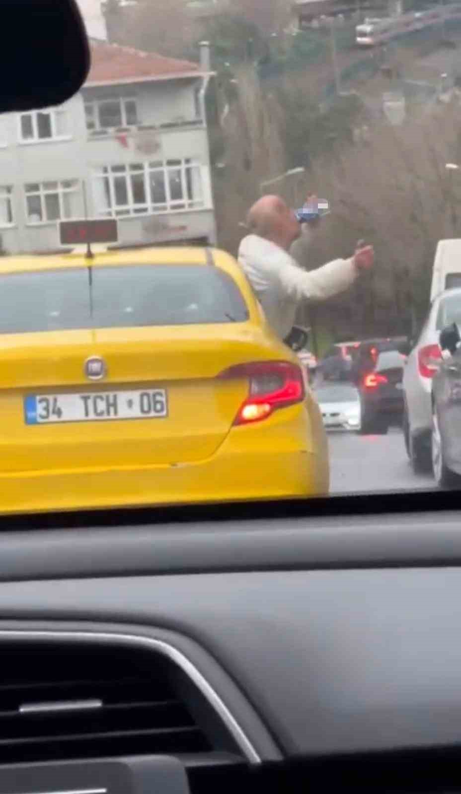 Olay dün saat 14.15 sıralarında Bayrampaşa Şehir Parkı Caddesi üzerinde meydana geldi. İddiaya göre, taksiye müşteri olarak binen bir kişi, araç seyrettiği esnada camdan dışarıya sarkarak alkol almaya başladı. Elindeki alkol şişesiyle kilometrelerce yolculuk yapan şahıs, uzun süre dans ederek tehlikeli yolculuğu sürdürdü. Taksi sürücüsünün de müdahale etmediği ya da edemediği alkollü müşteriyi trafikte görenler gözlerine inanamadı. O anlar bir başka sürücünün cep telefonu kamerasıyla kaydedildi.