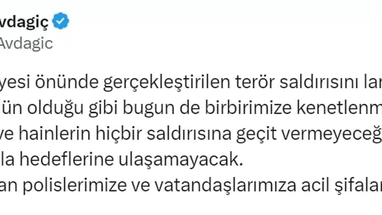 Avdagiç, ’’Çağlayan Adliyesi önünde gerçekleştirilen terör saldırısını lanetliyorum. Millet olarak dün olduğu gibi bugün de birbirimize kenetlenmeyi sürdüreceğiz ve hainlerin hiçbir saldırısına geçit vermeyeceğiz. Bu alçaklar asla hedeflerine ulaşamayacak. Yaralı kahraman polislerimize ve vatandaşlarımıza acil şifalar diliyorum’’ dedi.