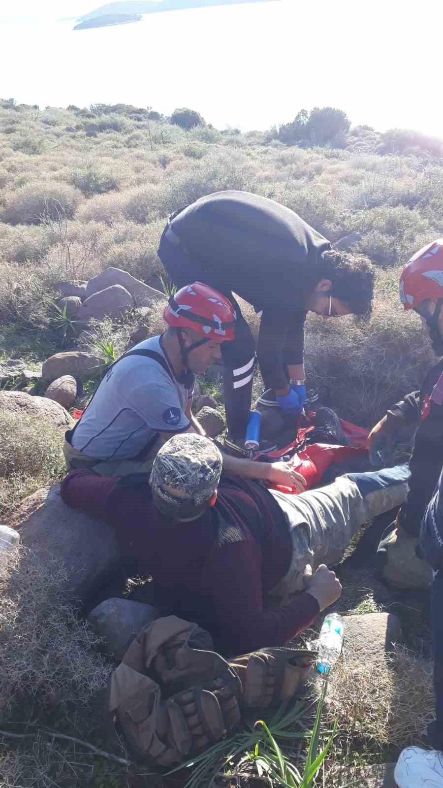 İzmir’in Çeşme ilçesinde, sarp kayalıkta avcılık yaparken düşen ve ayağından yaralanan vatandaş itfaiye ekipleri tarafından kurtarıldı.