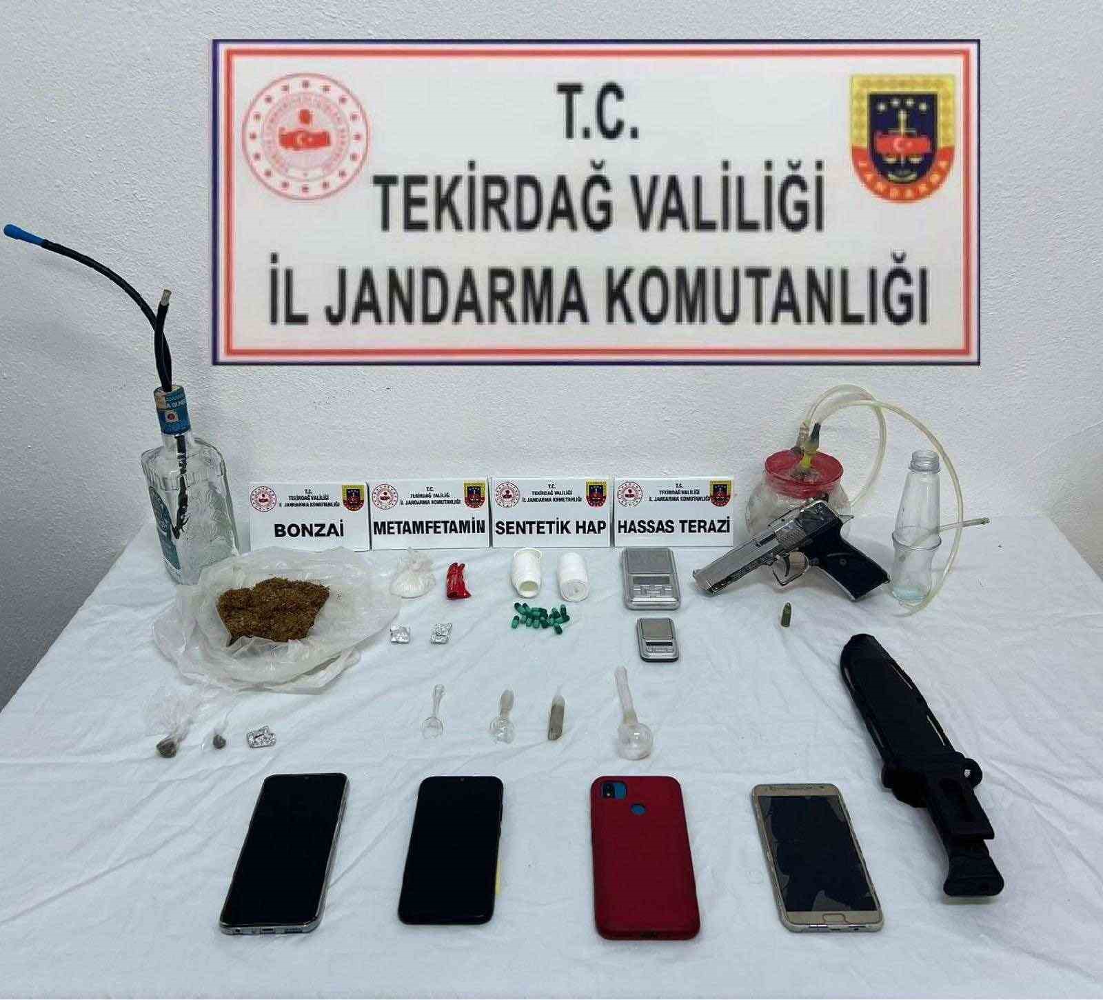 Tekirdağ İl Jandarma Komutanlığınca 9 ayrı adrese eş zamanlı şafak operasyonu düzenlendi. Operasyonda yapılan aramalarda 58 gram bonzai, 32 gram metamfetamin, 2 gram esrar, 16 adet sentetik hap, 2 adet hassas terazi, 1 adet kurusıkı tabanca, 3 adet uyuşturucu madde kullanma aparatı, 1 adet kasatura bıçak, 1 adet fişek ve 4 adet cep telefonu ele geçirildi. S.B., K.K., N.Ç. isimli 3 şüpheli gözaltına alınırken; Ş.G., B.Ç., O.C.K., S.B., T.T., M.G. isimli şahıslar hakkında uyuşturucu madde kullanmak suçundan işlem yapıldı.