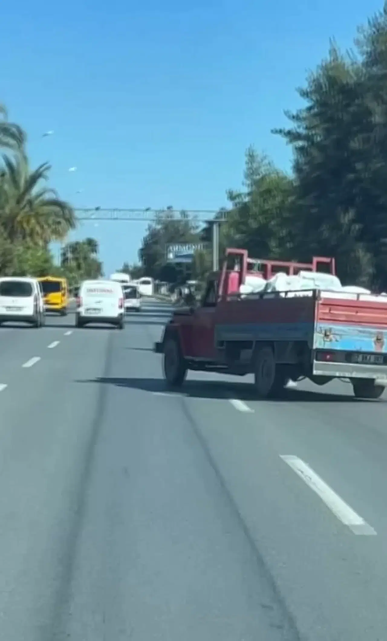 Antalya’nın Alanya ilçesinde bir kamyonet sürücüsünün seyir halindeyken zikzak çizerek sağ şeritten sol şeride geçip trafikteki diğer sürücüleri tehlikeye attığı anlar cep telefonu kamerasına yansıdı.