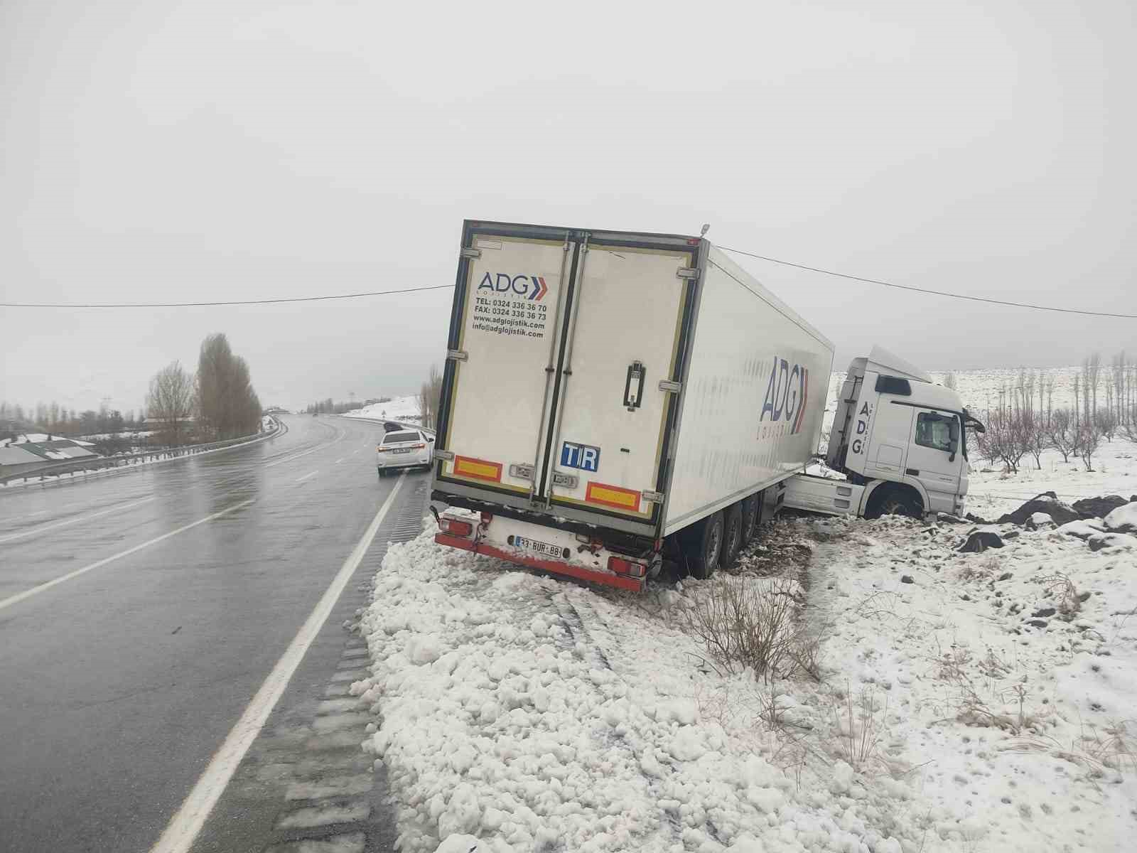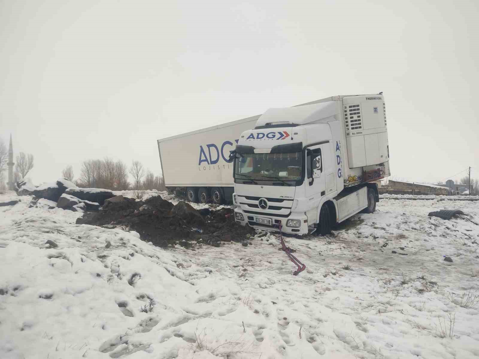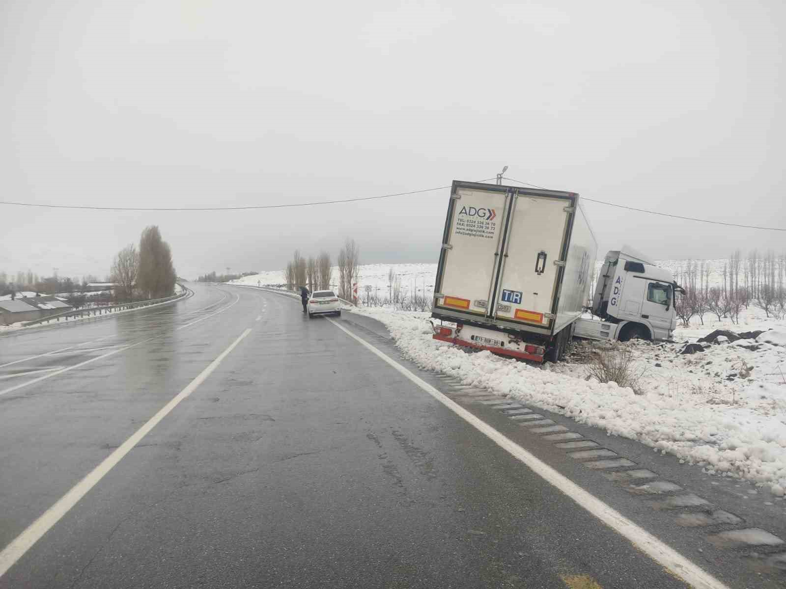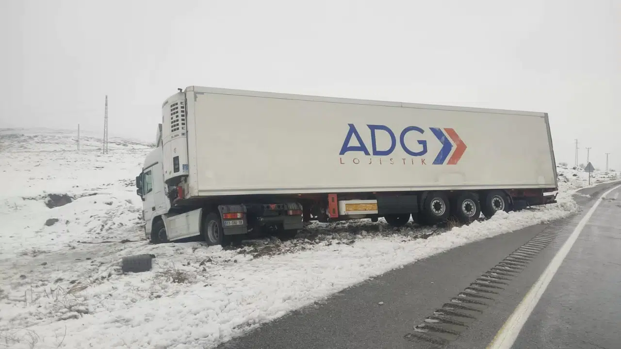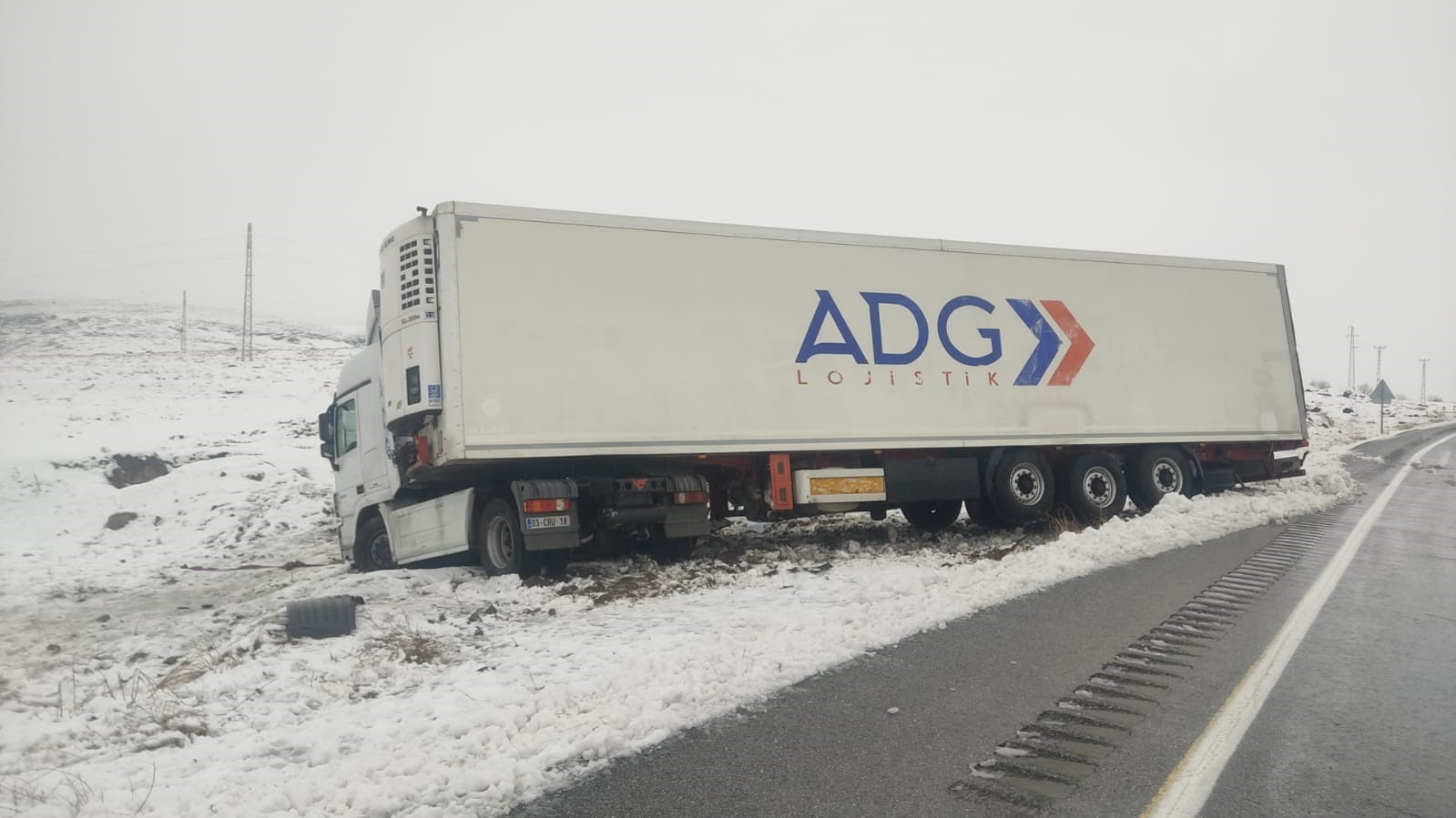Van’ın Çaldıran ilçesinde kar yağışı ve buzlanmadan dolayı tır yoldan çıktı.