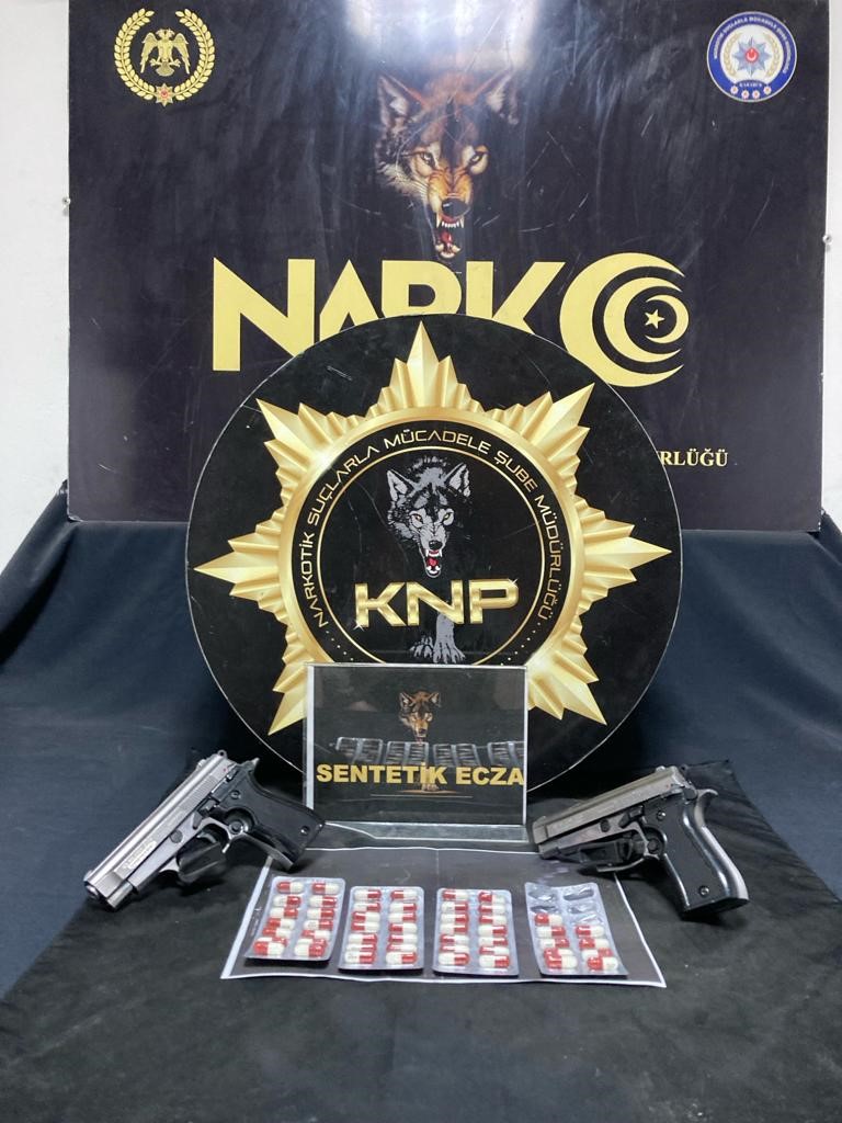 Durumundan şüphelenilen M.K, E.S ve A.G’nin yapılan üst aramasında; 51 adet sentetik ecza ve 2 adet ruhsatsız tabanca ele geçirildi.