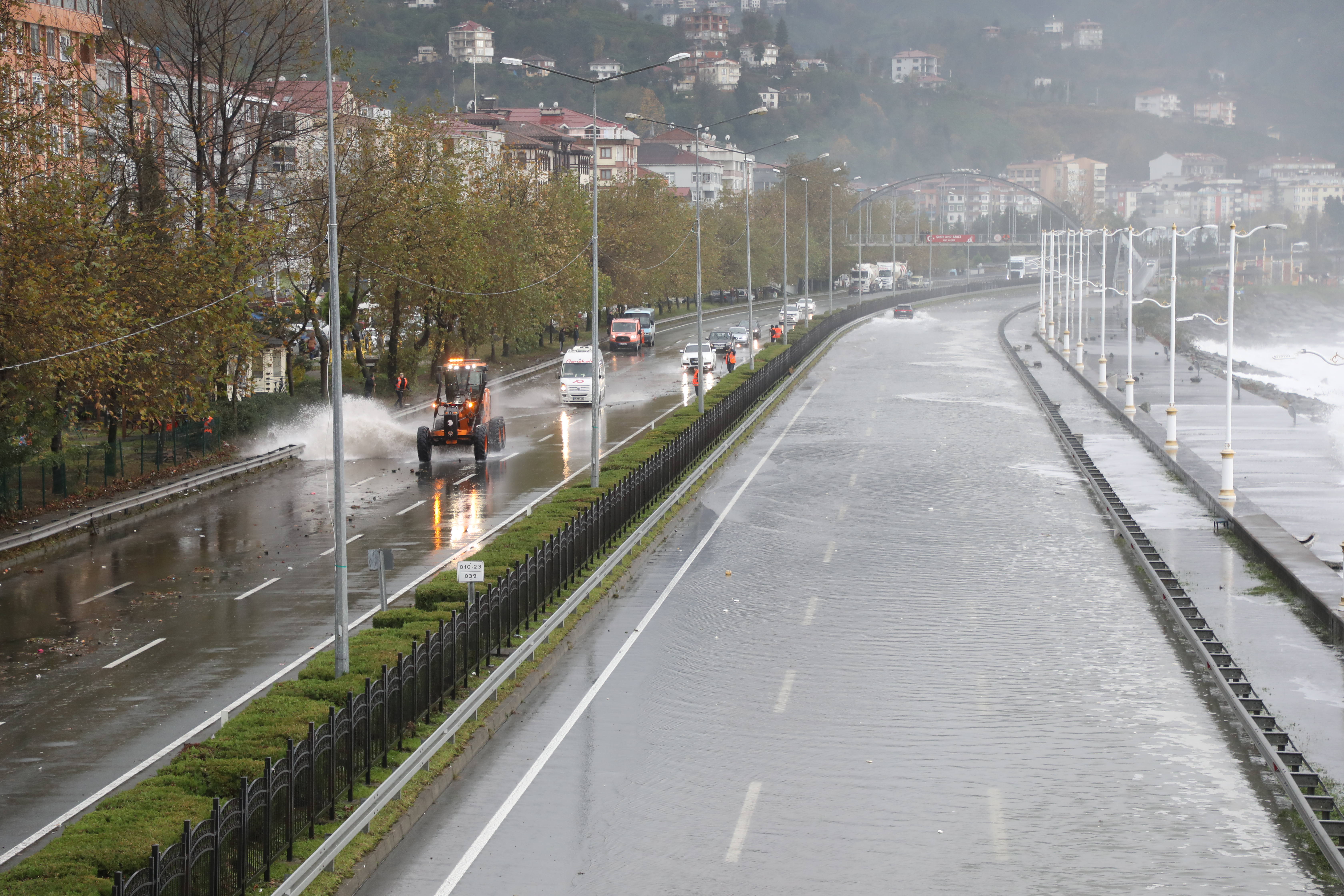 Karayolları ekipleri, yoldaki rüsubatı iş makineleriyle temizliyor. Dev dalgalar, zaman zaman Artvin istikametindeki şeride de ulaşıyor.