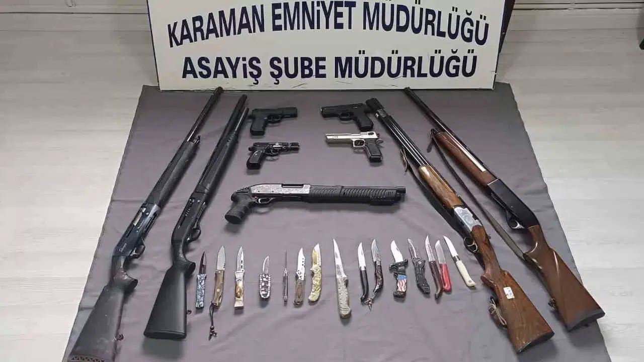 Karaman İl Emniyet Müdürlüğü’nün asayiş uygulamalarında uyuşturucu ve ruhsatsız silahlar ele geçirilirken, yakalanan 12 aranan şahıs tutuklandı.