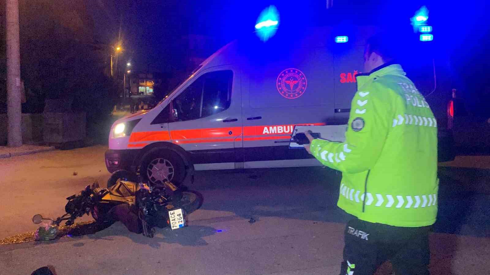 Kaza, Osmangazi Mahallesi 1053. Sokak üzerindeki kontrolsüz kavşakta meydana geldi. Edinilen bilgiye göre, S.A. idaresindeki 70 EU 165 plakalı otomobil ile C.N.İ. (23) yönetimindeki 70 ACE 264 plakalı motosiklet kavşakta çarpıştı. Çarpışmanın etkisiyle savrulan motosiklet sürücüsü C.N.İ. ile arkasındaki yolcu E.P. yaralandı. İhbar üzerine olay yerine sağlık ve polis ekipleri sevk edildi. Kazada yaralanan 2 kişi ambulanslarla Karaman Eğitim ve Araştırma Hastanesi’ne kaldırılarak tedavi altına alındı.