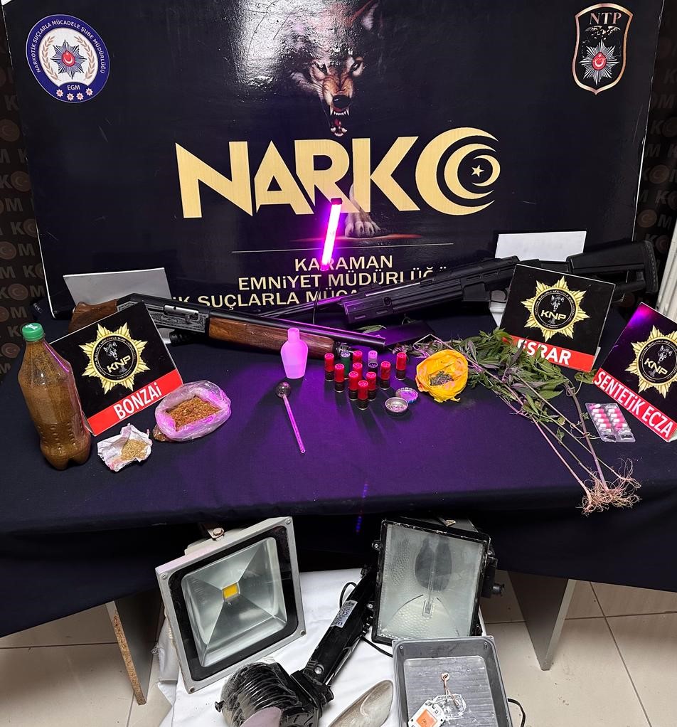Edinilen bilgiye göre, İl Emniyet Müdürlüğü Narkotik Suçlarla Mücadele Şubesi ekipleri, uyuşturucu madde ticareti ve kullanılmasının önlenmesine yönelik yürüttüğü 2 ayrı çalışmada Y.K. ve M.Ö. isimli kişileri gözaltına aldı. Şüphelilerin üst ve ikametlerinde yapılan aramalarda 323 gram bonzai, 20 gram eroin, 3 gram metamfetamin, 5 adet kullanımı kontrole tabi hap, 23 adet sentetik hap, 6 gram esrar, 9 kök kenevir bitkisi, 11 gram kenevir tohumu, 1 adet av tüfeği ile kenevir yetiştirme düzenekleri ele geçirildi.