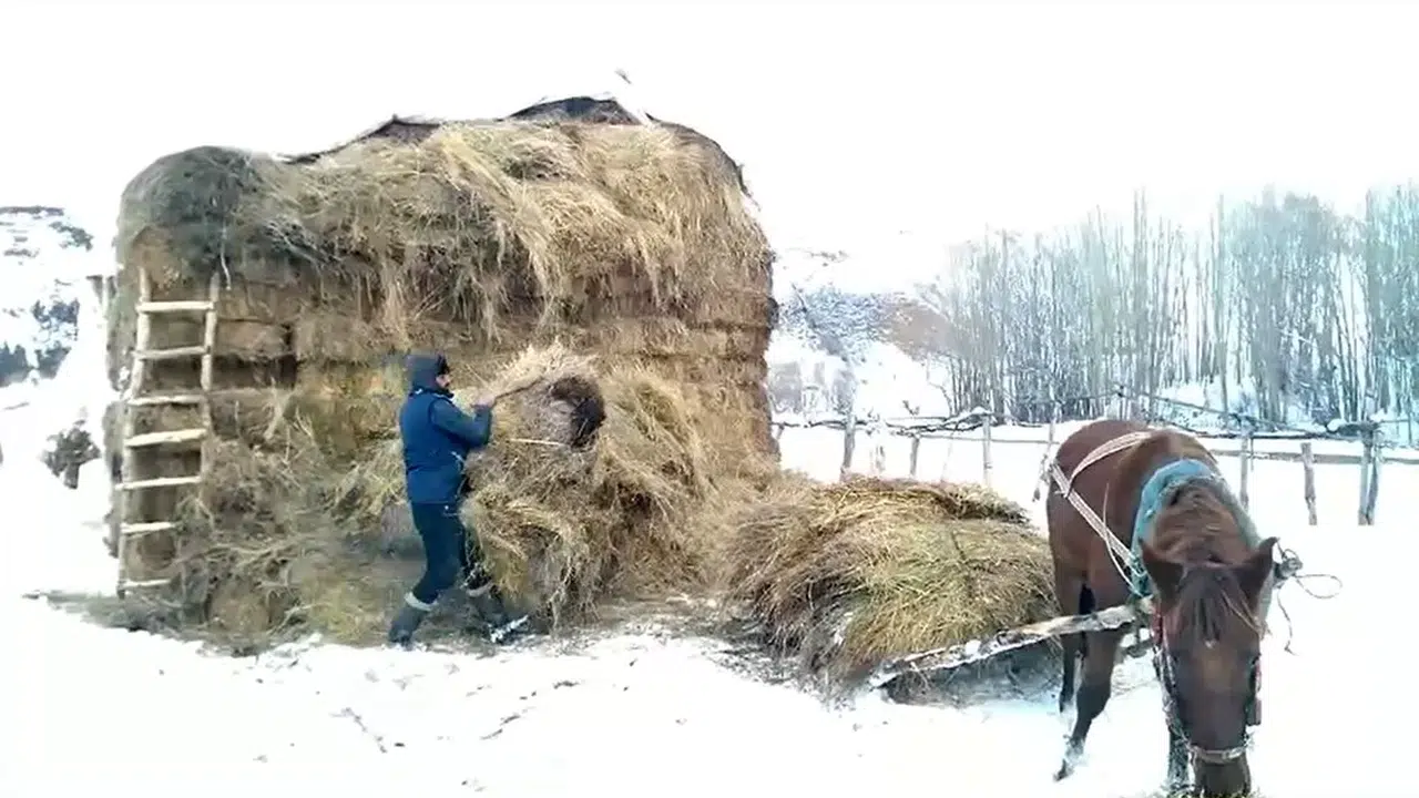 Bingöl’ün Karlıova ilçesinde çetin geçen kış aylarına rağmen besiciler, yaklaşık 1,5 kilometre boyunca at ve kızaklarla taşıdığı otlarla hayvanlarını besliyor.