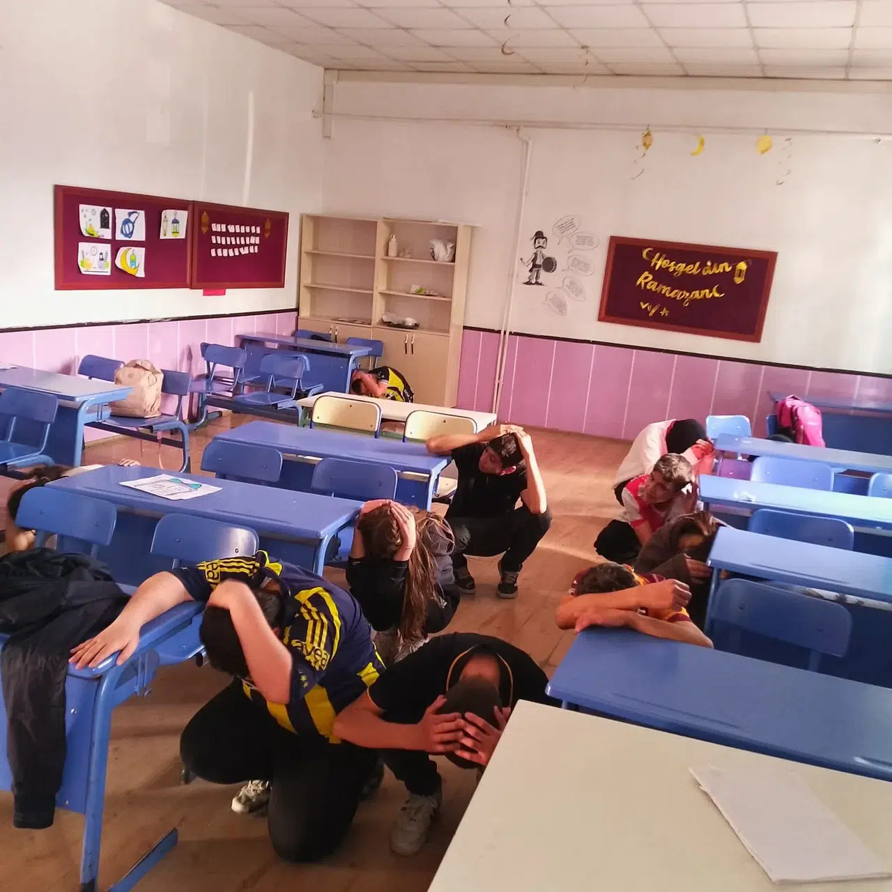Deprem Haftası ve Sivil Savunma Günü kapsamında öğrencilerin afetlere karşı bilinçli ve hazırlıklı olmalarını sağlamak amacıyla düzenlenen tatbikatta, deprem anında yapılması gereken "çök–kapan–tutun" hareketi uygulamalı olarak gösterildi.