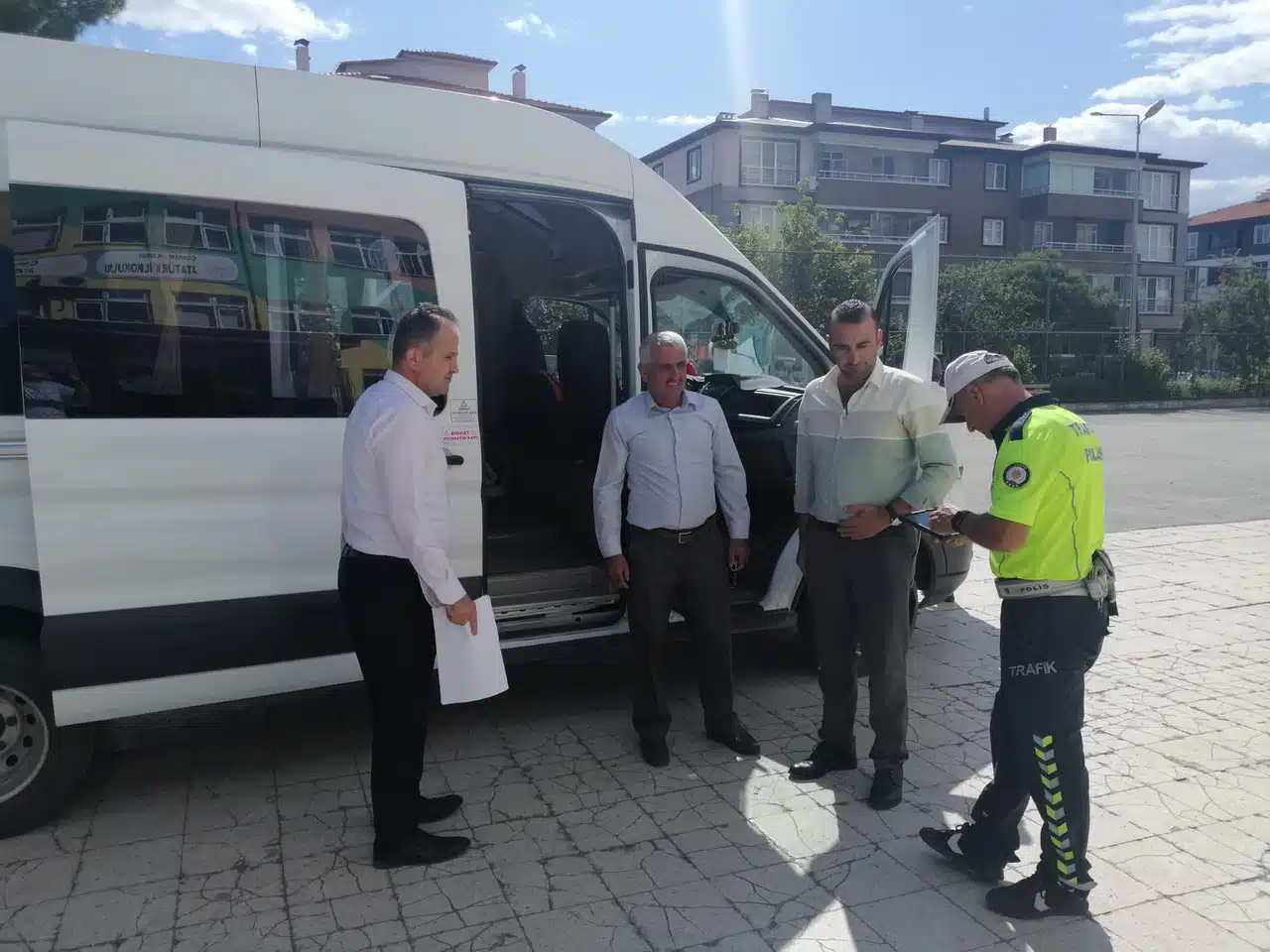 Servis araçlarının, Milli Eğitim Bakanlığının servis araçlarıyla ilgili yönetmeliklerine uygunluğu kontrol edilirken, trafik polisleri de araçların evraklarını kontrol ederek, kurallara uyup uymadıklarını denetledi. (AA)