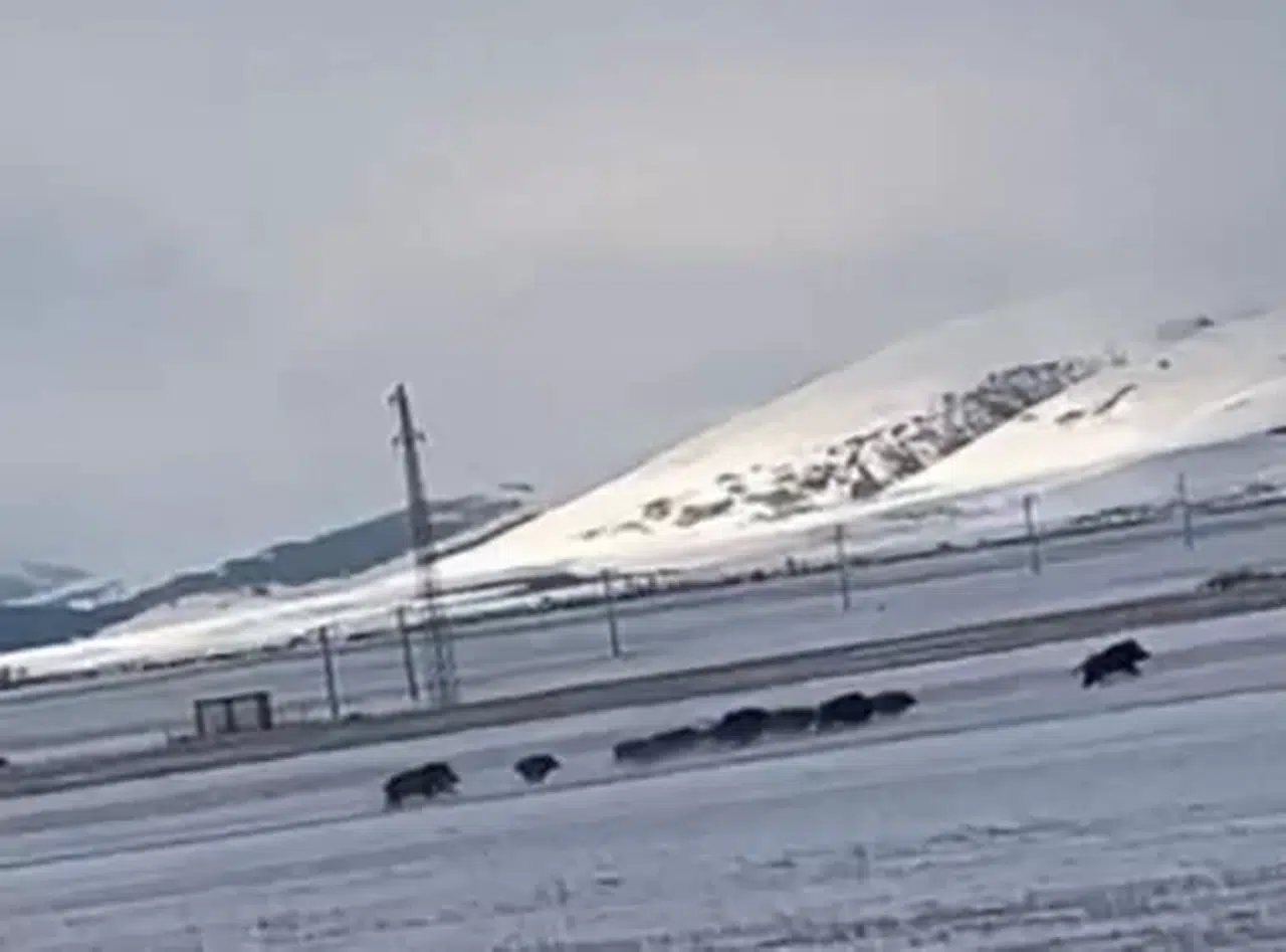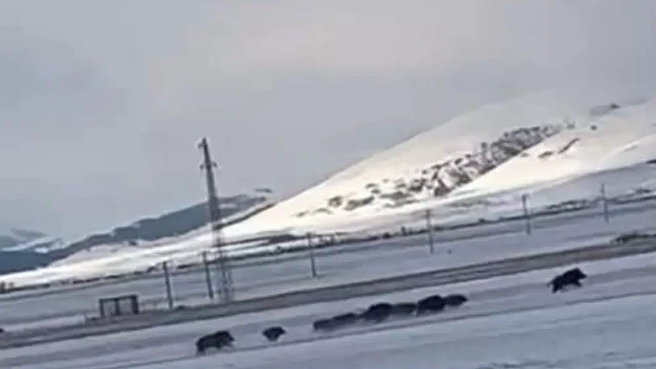 Karla kaplı Ardahan Ovası’nda domuz sürüsünün kaçışı cep telefonu ile görüntülendi. Görüntülerde, sürü halinde ilerleyen domuzların Sulakyurt köyüne doğru koşması yer alıyor.