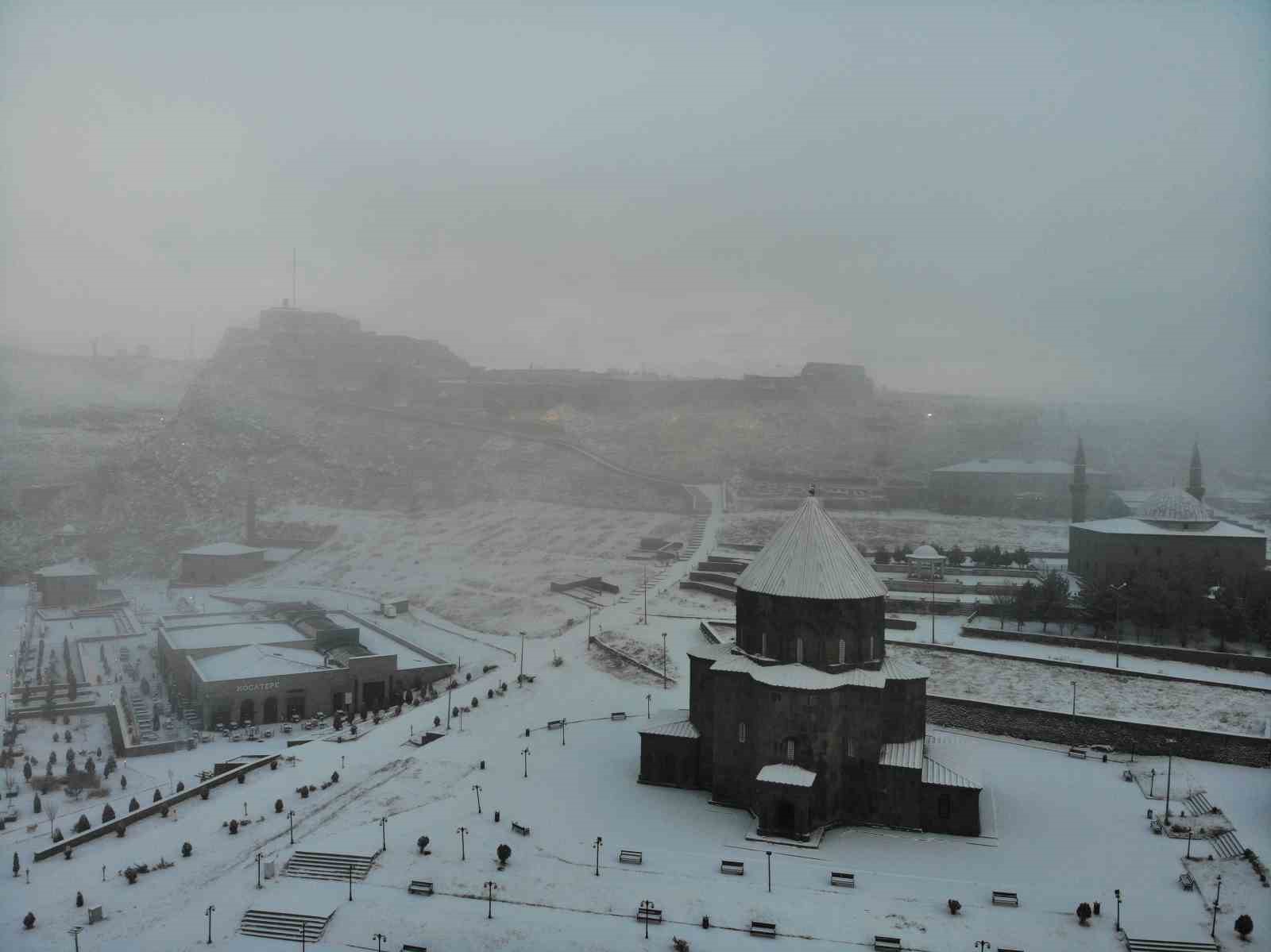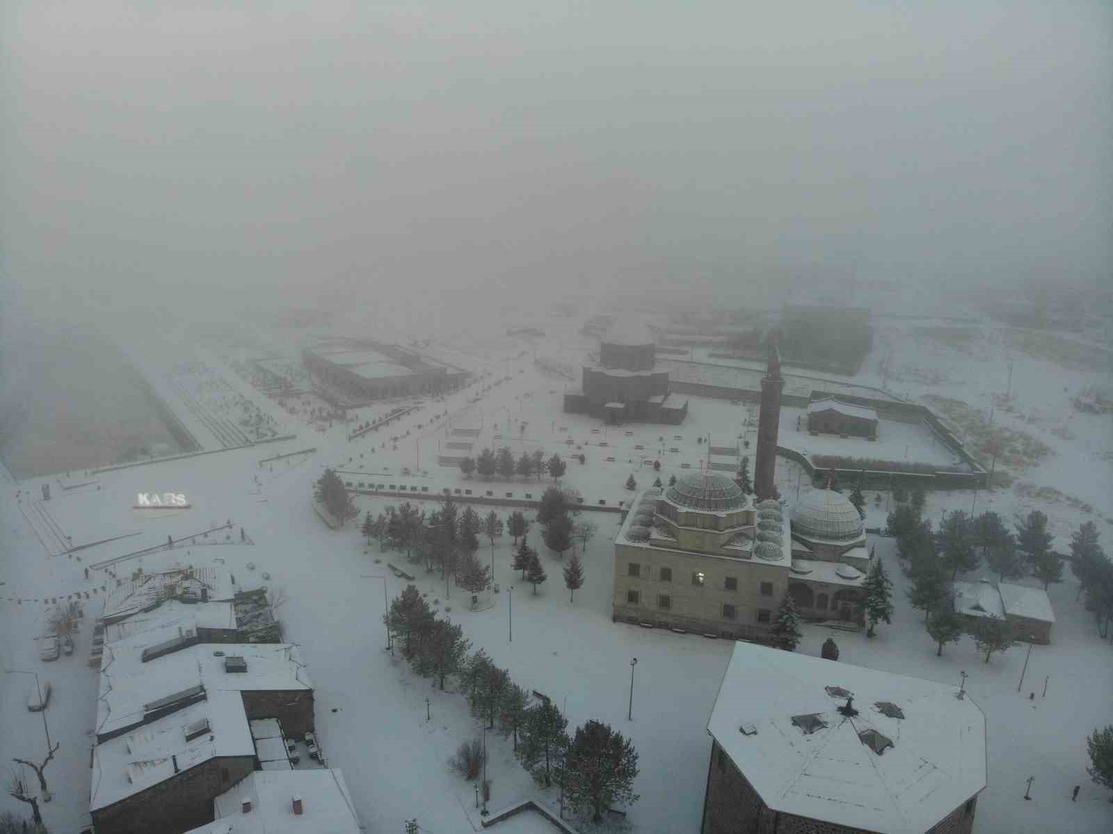 Kars’ta bir aydır beklenen kar yağdı. Kars’ın simgelerinden biri olan Kars Kalesi ise yoğun sis altında kayboldu. O anlar drone ile kaydedildi.