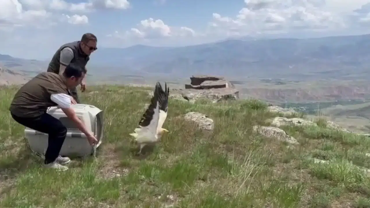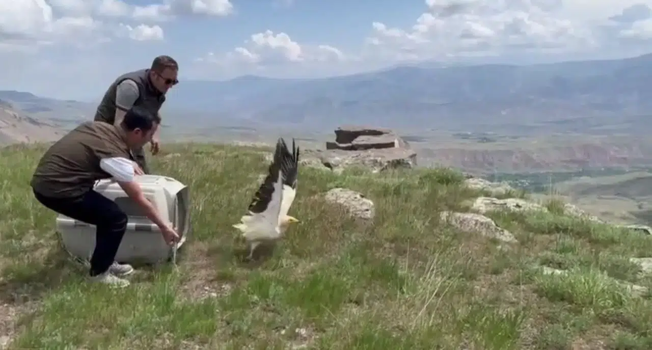 Kars’ın en yüksek yerlerinden Karadağ bölgesine getirilen yavru akbaba burada DKMP ekiplerince kafesin kapısı açılarak doğa salındı. Gökyüzüne yükselen yavru akbaba daha sonra uçarak gözlerden kayboldu.