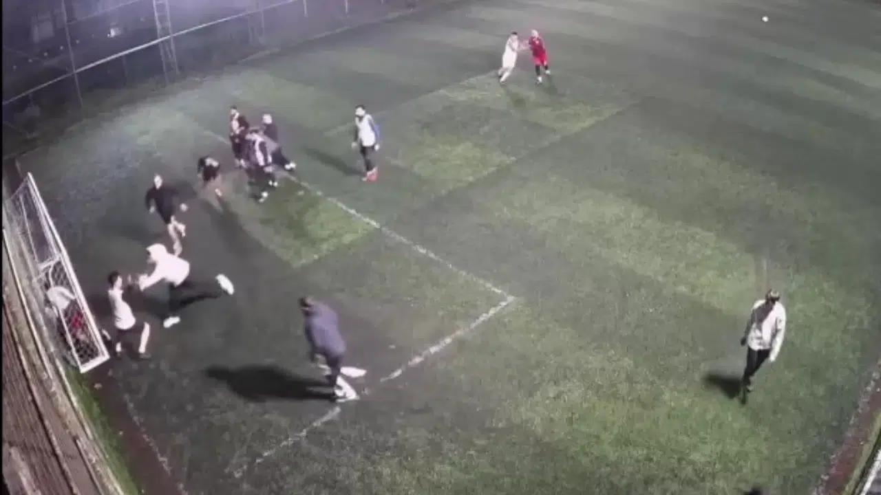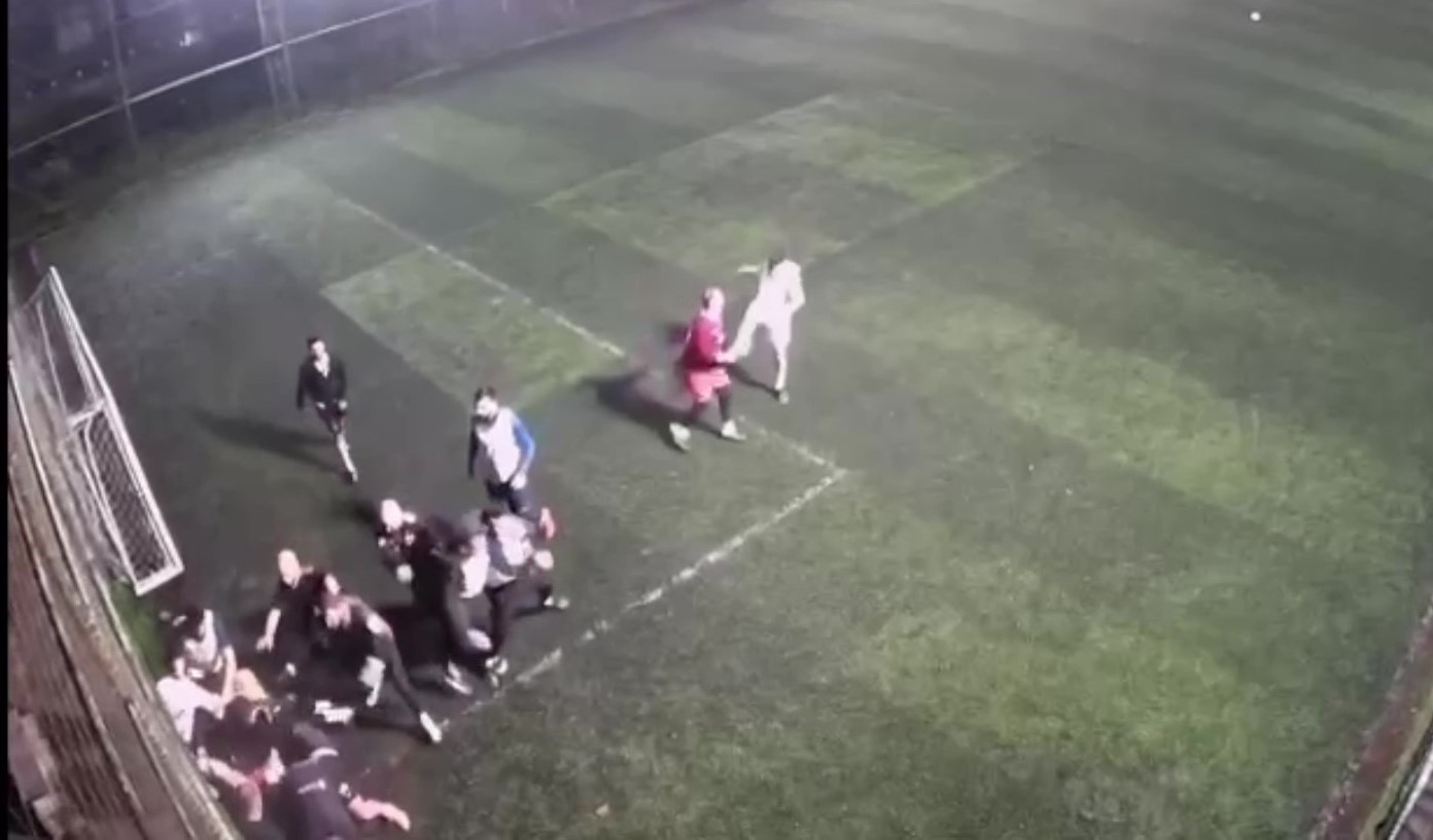 Kartal’da halı saha maçında yapılan faul sonrası iki takım oyuncuları birbirine girdi. Tekme ve yumrukların havada uçuştuğu kavga anları halı saha kamerasına yansıdı.