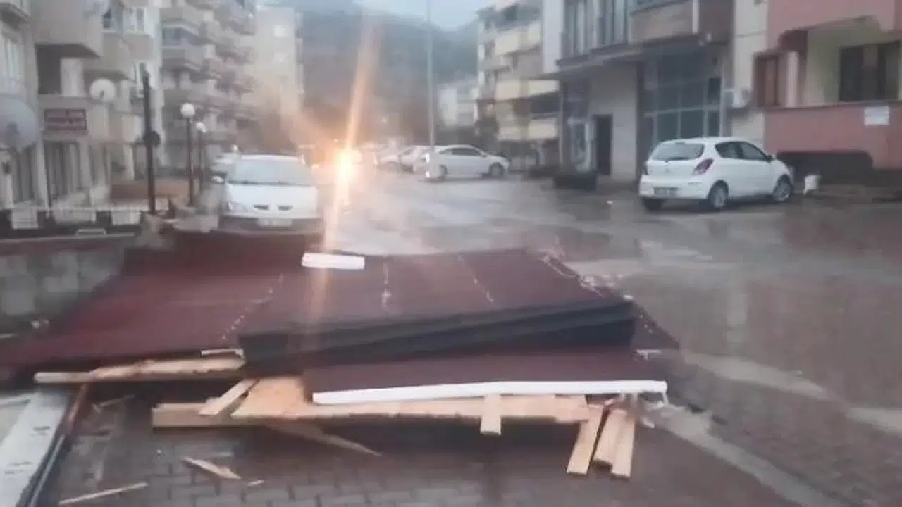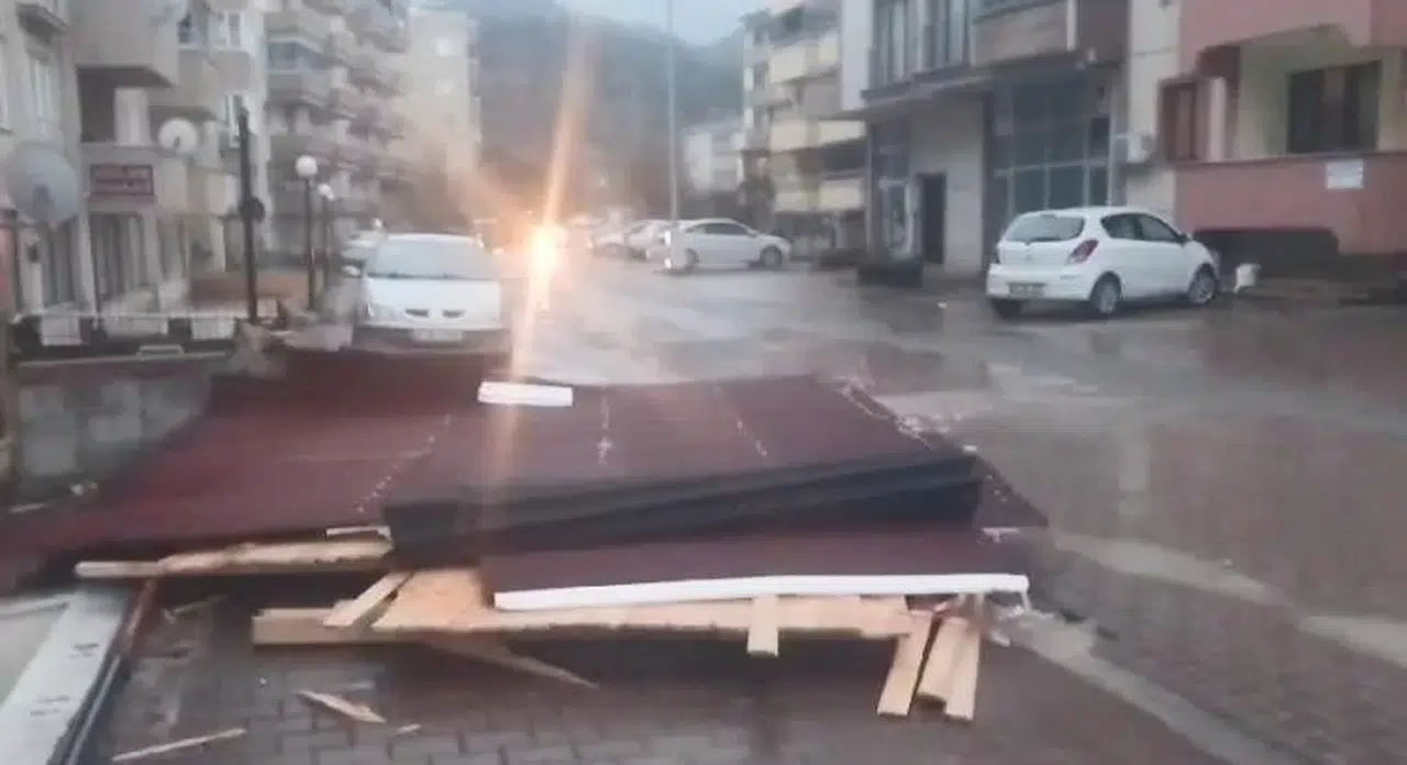 Meteorolojinin fırtına uyarısında bulunduğu Kastamonu’da etkili olan kuvvetli rüzgar hayatı olumsuz etkiledi. Cide ilçesinde fırtınanın şiddetine dayanamayan iki binanın çatısı uçtu. Uçan çatıların düştüğü alanda vatandaşların olmaması ihtimal faciayı önledi. Çatıları uçan binalarda ekipler tarafından güvenlik önlemi alındı.