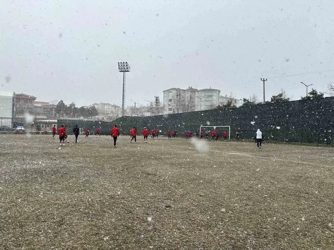 Antrenman sırasında kar yağışına yakalandıklarını ifade eden Yardımcı Antrenör Hakan Albayrak, “Gördüğünüz gibi yoğun kar yağışı altında çalışmalarımız devam ediyor. Bu da Allah’ın bir hikmeti. Hocamızın nezaretinde çalışmalarımızı sürdürüyoruz. Bir anda geldi ve 5 dakikada her yeri kapladı. 15 dakika daha sürse her yer kaplanır. Bu geceden sonra yağış bekleniyordu, şartlarımız bu şekilde” dedi.